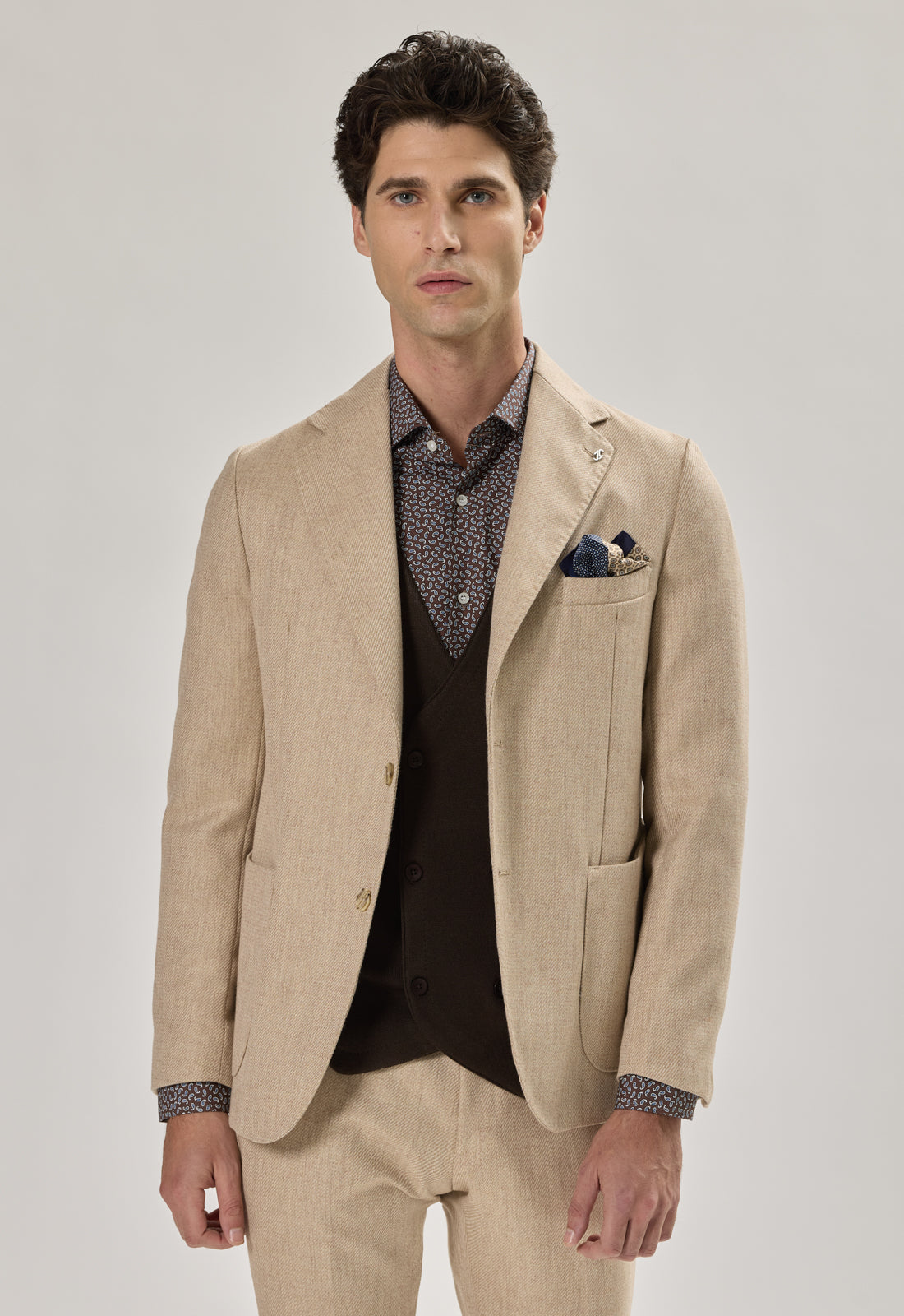 Giacca a Tasche a Toppa: La giacca presenta un design decostruito ma raffinato, con classiche tasche a toppa che conferiscono un tocco di sportività ricercata (stile casual-chic). Il rever a lancia morbido e la chiusura a due bottoni valorizzano la silhouette maschile.