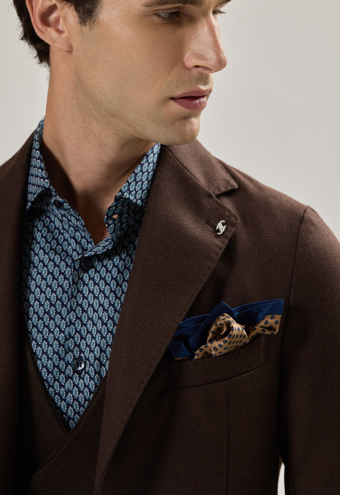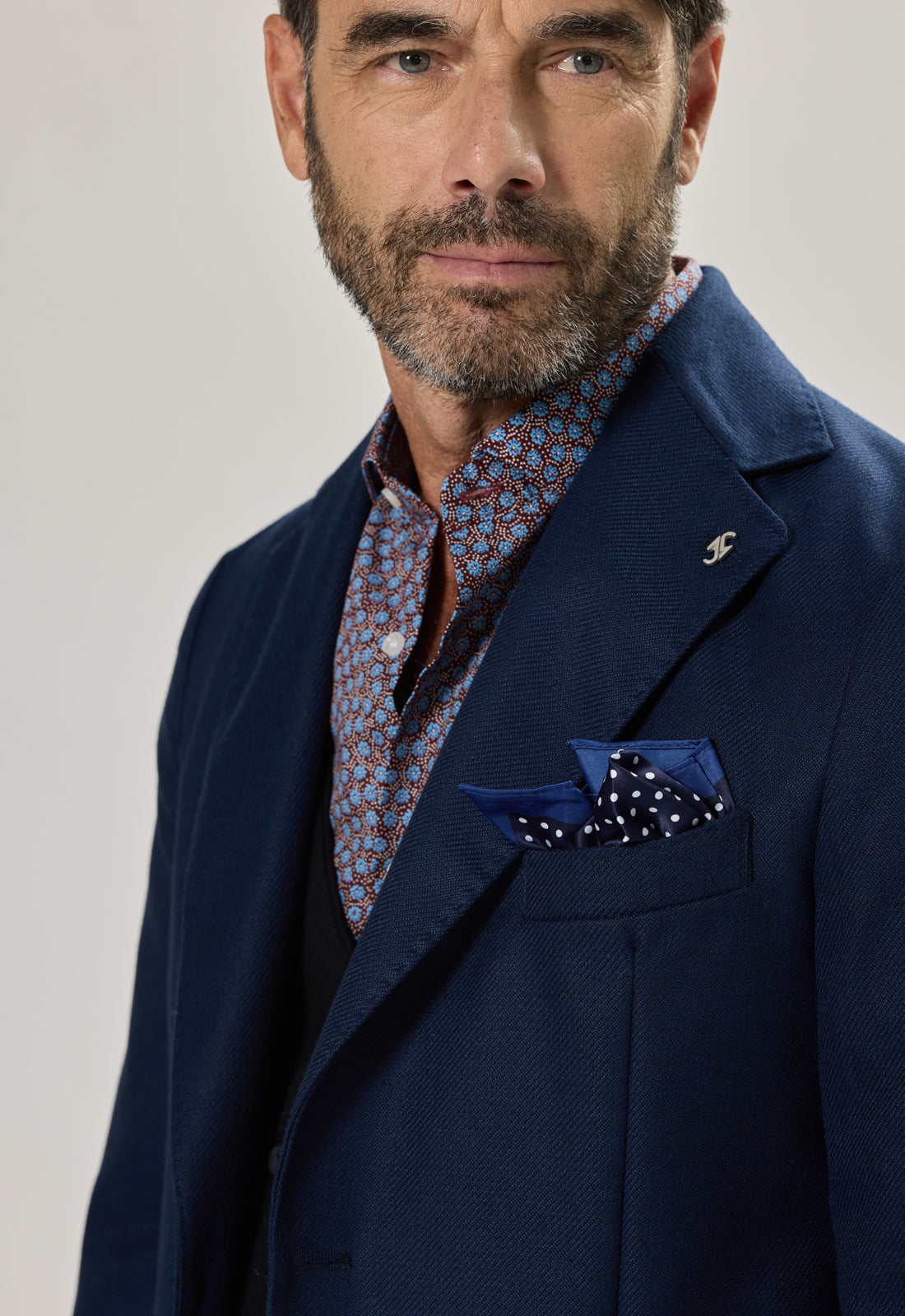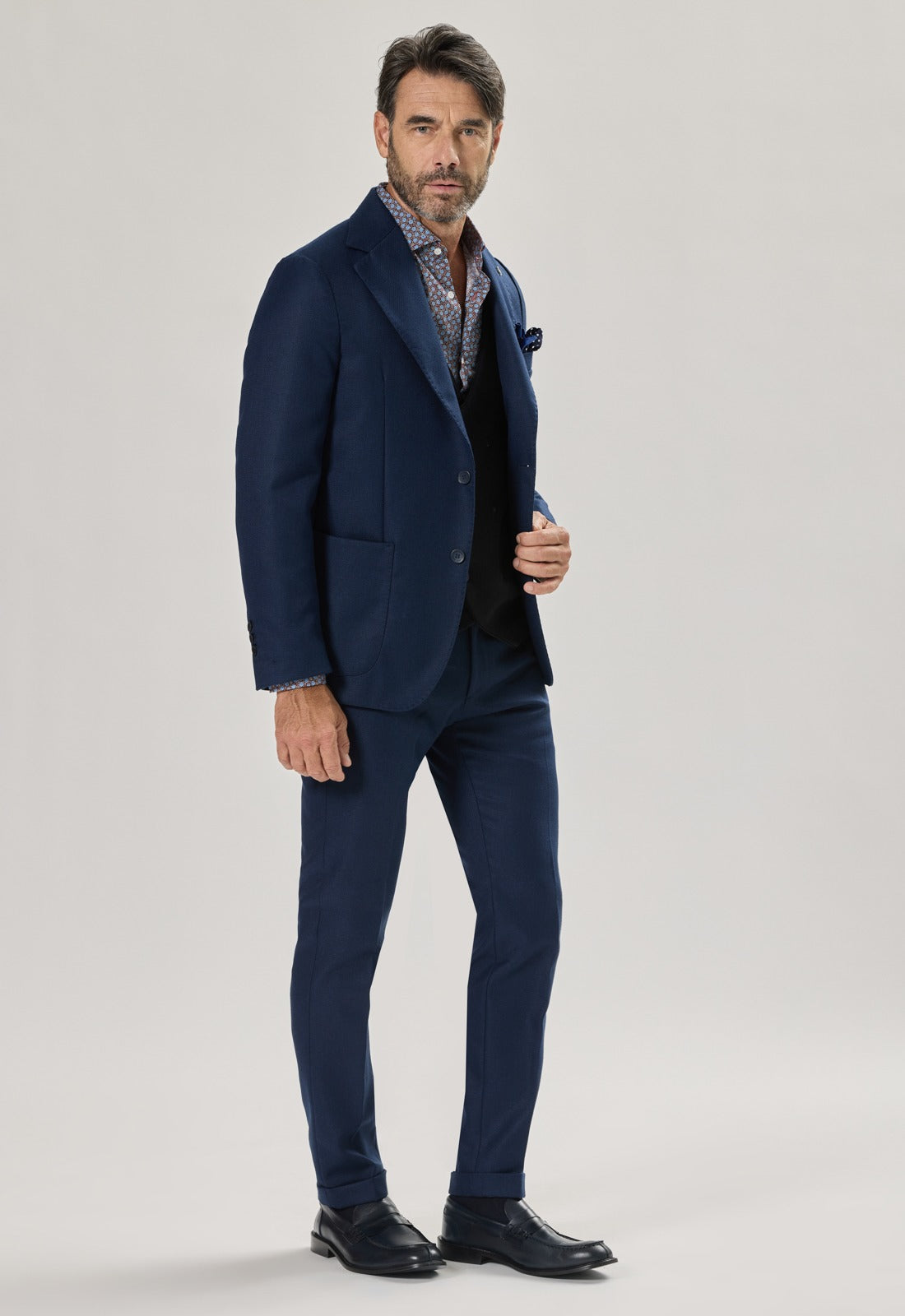 Tessuto Premium: Realizzato in un mix di fibre nobili che garantiscono traspirabilità e una tenuta della piega eccellente durante tutta la giornata. La trama leggermente a rilievo aggiunge profondità visiva al colore.