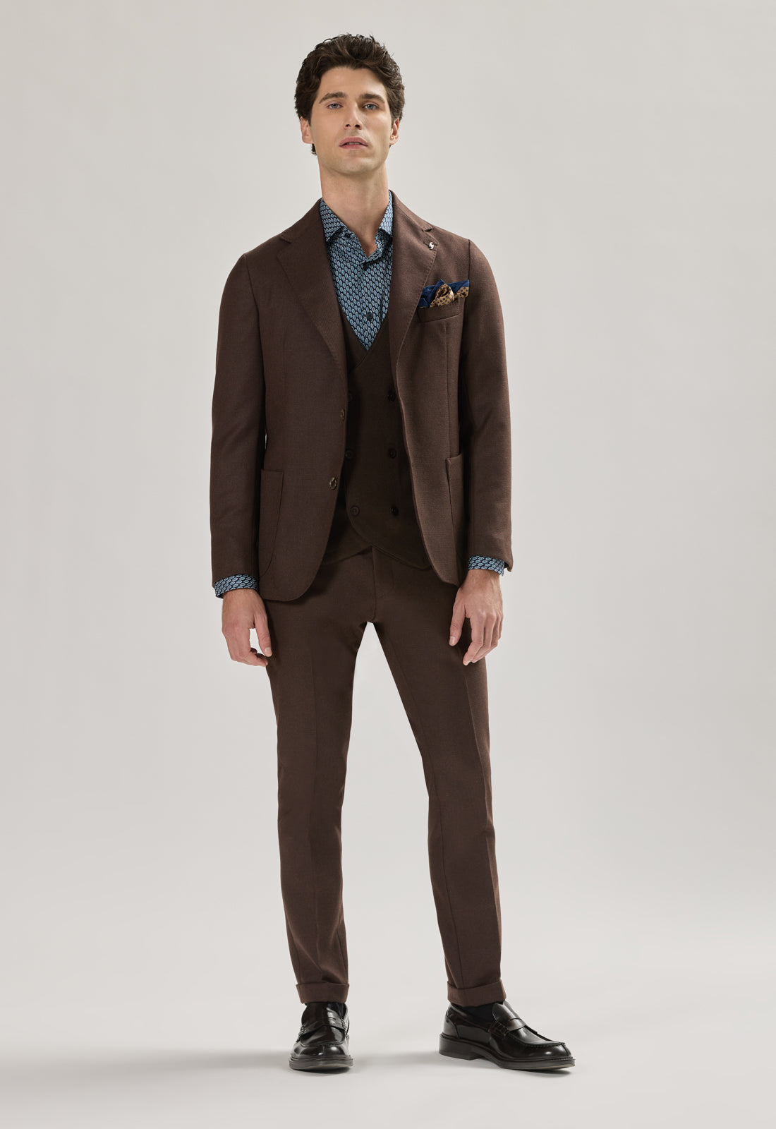 Pantalone Slim Fit: Il pantalone coordinato presenta un taglio moderno leggermente affusolato, con fondo risvoltato per esaltare la scelta della calzatura, sia essa un mocassino formale o una stringata.