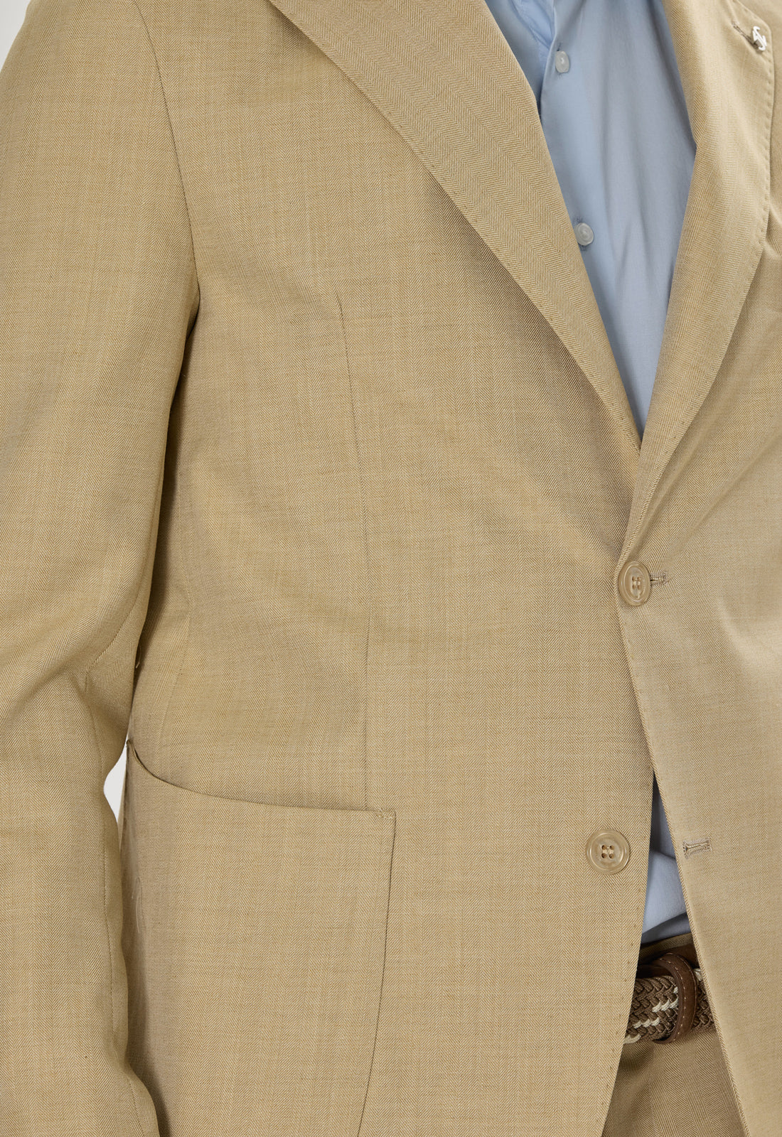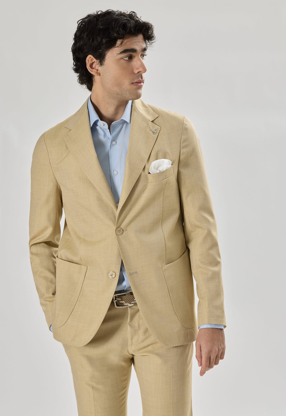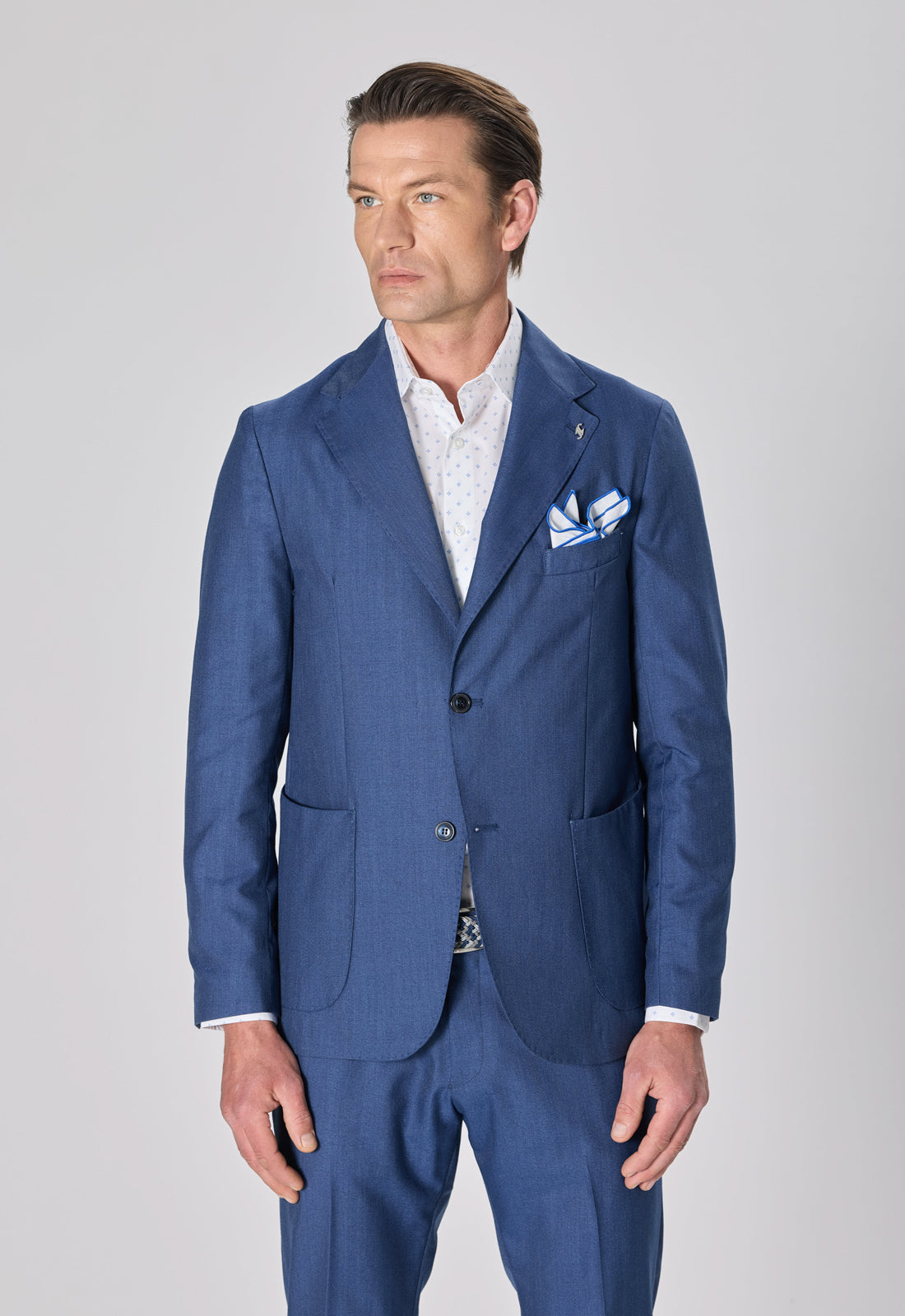 Giacca Monopetto: Costruzione leggera a due bottoni con revers a dente. Le tasche a toppa conferiscono un tocco sportivo e ricercato, rendendo la giacca perfetta da indossare anche separatamente con un paio di jeans o chino.