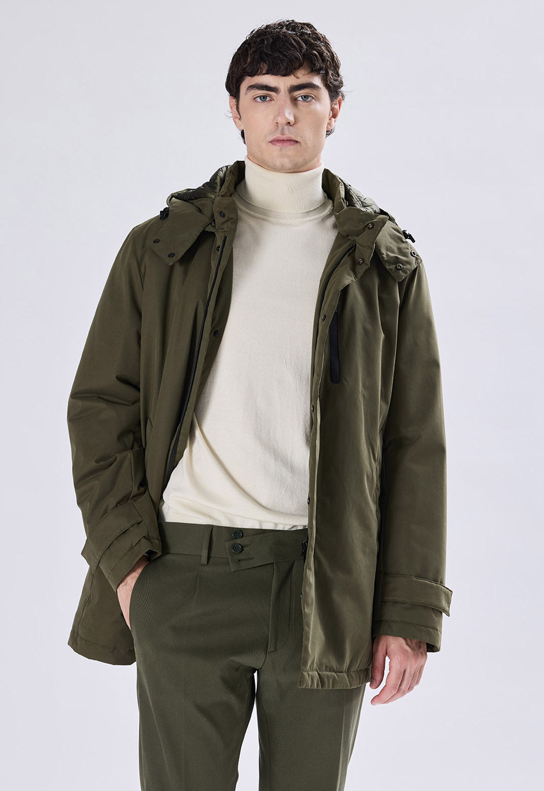 Affronta ogni condizione meteorologica con lo stile robusto e moderno del Parka Tecnico con cappuccio. Questo giaccone è l'alleato perfetto per chi cerca un capo che unisca funzionalità ad alte prestazioni e design contemporaneo. Realizzato in un tessuto tecnico resistente a leggere piogge e al vento, ti mantiene asciutto e caldo, rendendolo ideale per l'uso quotidiano in città e per le avventure del weekend