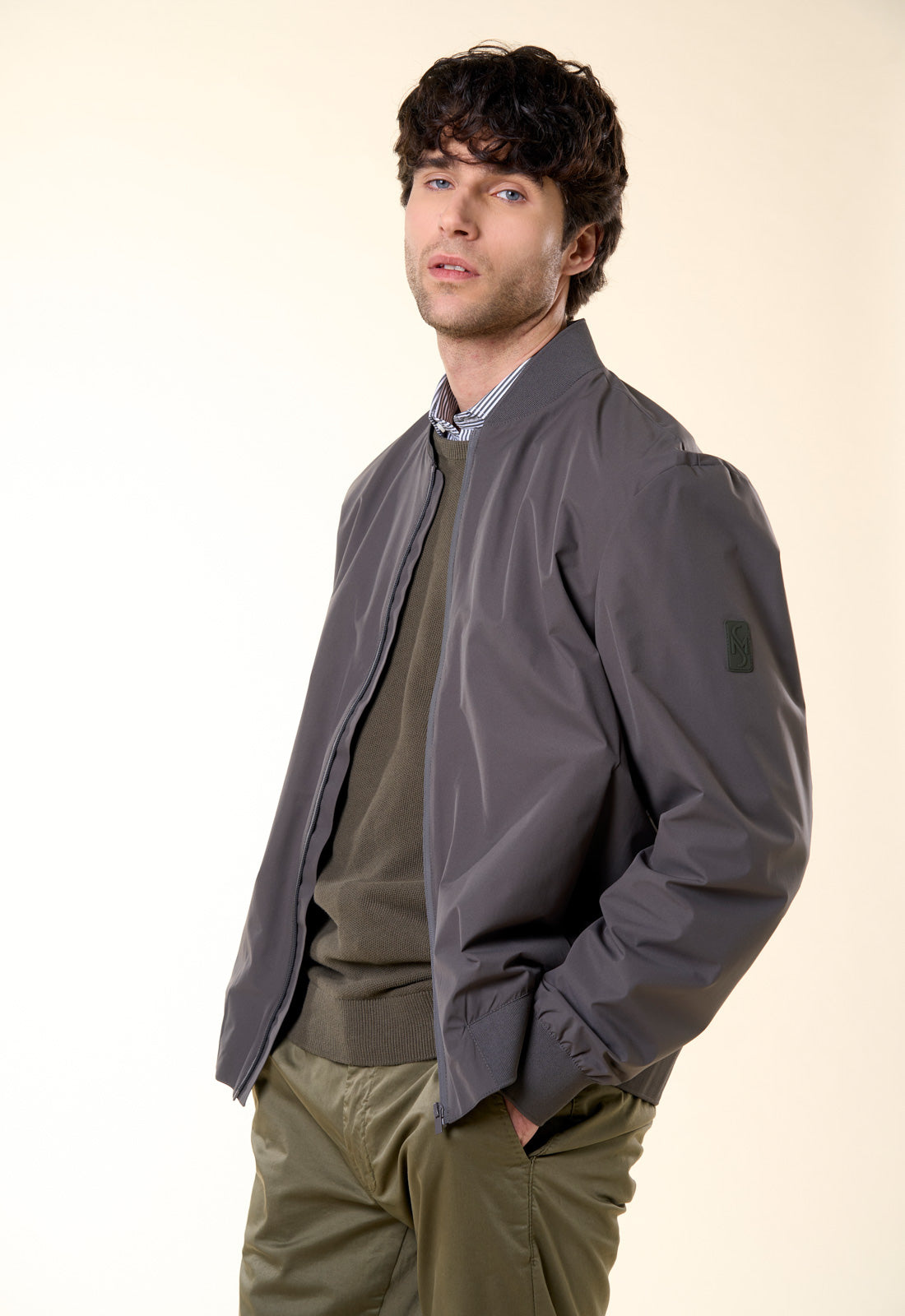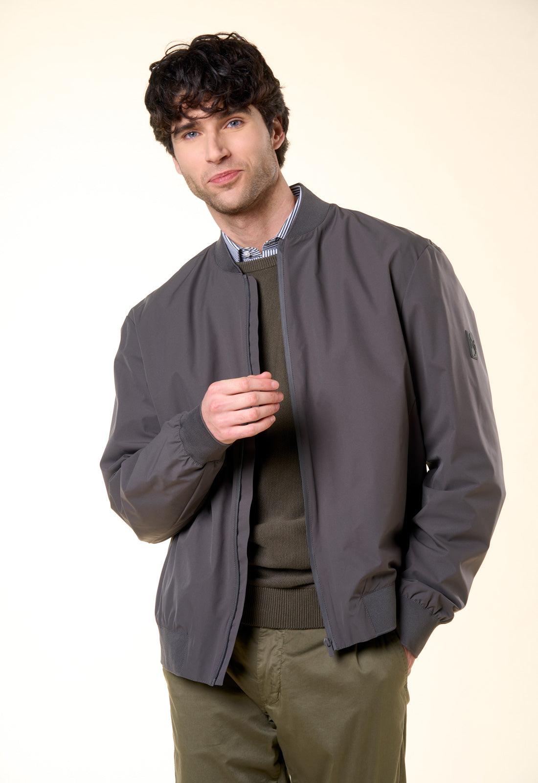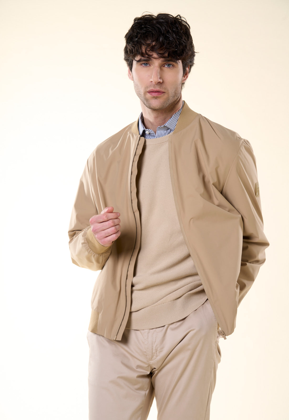 Raffinato, versatile e dal taglio contemporaneo: questo bomber è il capospalla essenziale per la mezza stagione. Realizzato in un tessuto tecnico leggero con finitura opaca, combina la praticità di una giacca a vento con l'eleganza di un design pulito e minimale. Il design è caratterizzato da una silhouette classica rivisitata in chiave moderna. Il collo, i polsini e il fondo sono rifiniti in maglia a costine elasticizzata in tono, garantendo una vestibilità confortevole che mantiene la forma nel tempo.