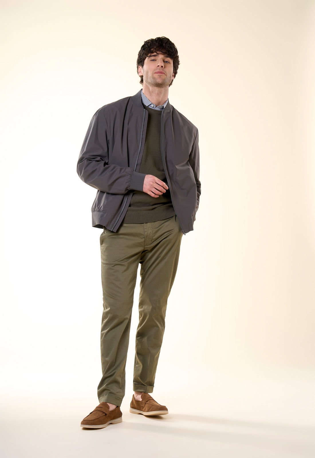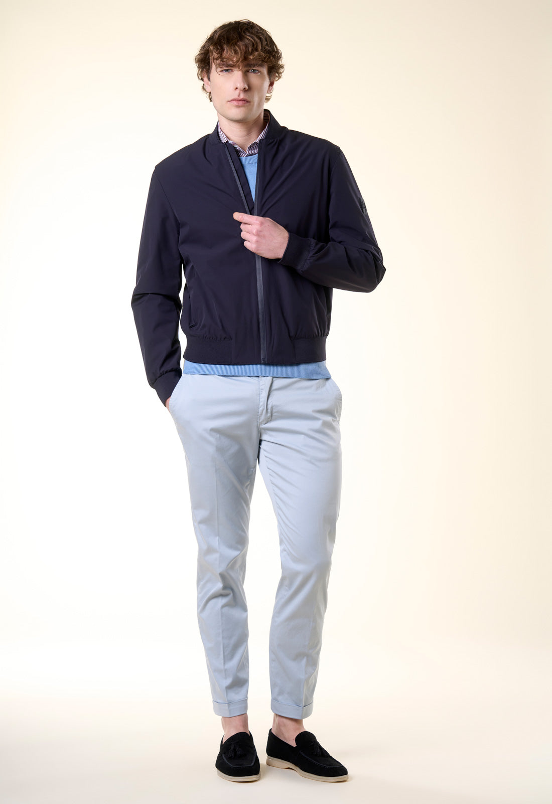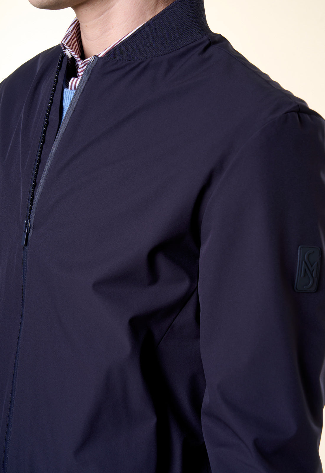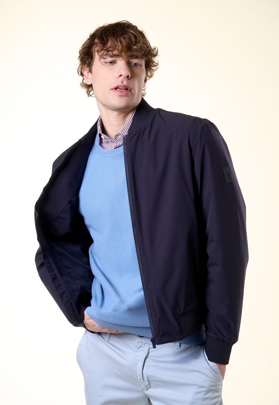 Raffinato, versatile e dal taglio contemporaneo: questo bomber è il capospalla essenziale per la mezza stagione. Realizzato in un tessuto tecnico leggero con finitura opaca, combina la praticità di una giacca a vento con l'eleganza di un design pulito e minimale. Il design è caratterizzato da una silhouette classica rivisitata in chiave moderna. Il collo, i polsini e il fondo sono rifiniti in maglia a costine elasticizzata in tono, garantendo una vestibilità confortevole che mantiene la forma nel tempo.
