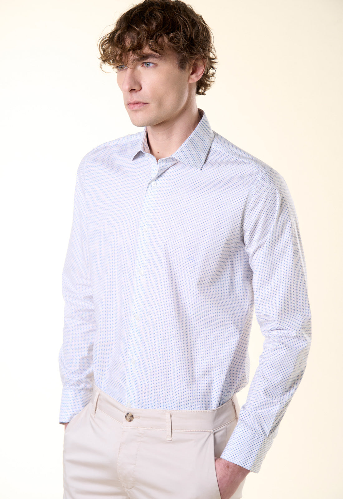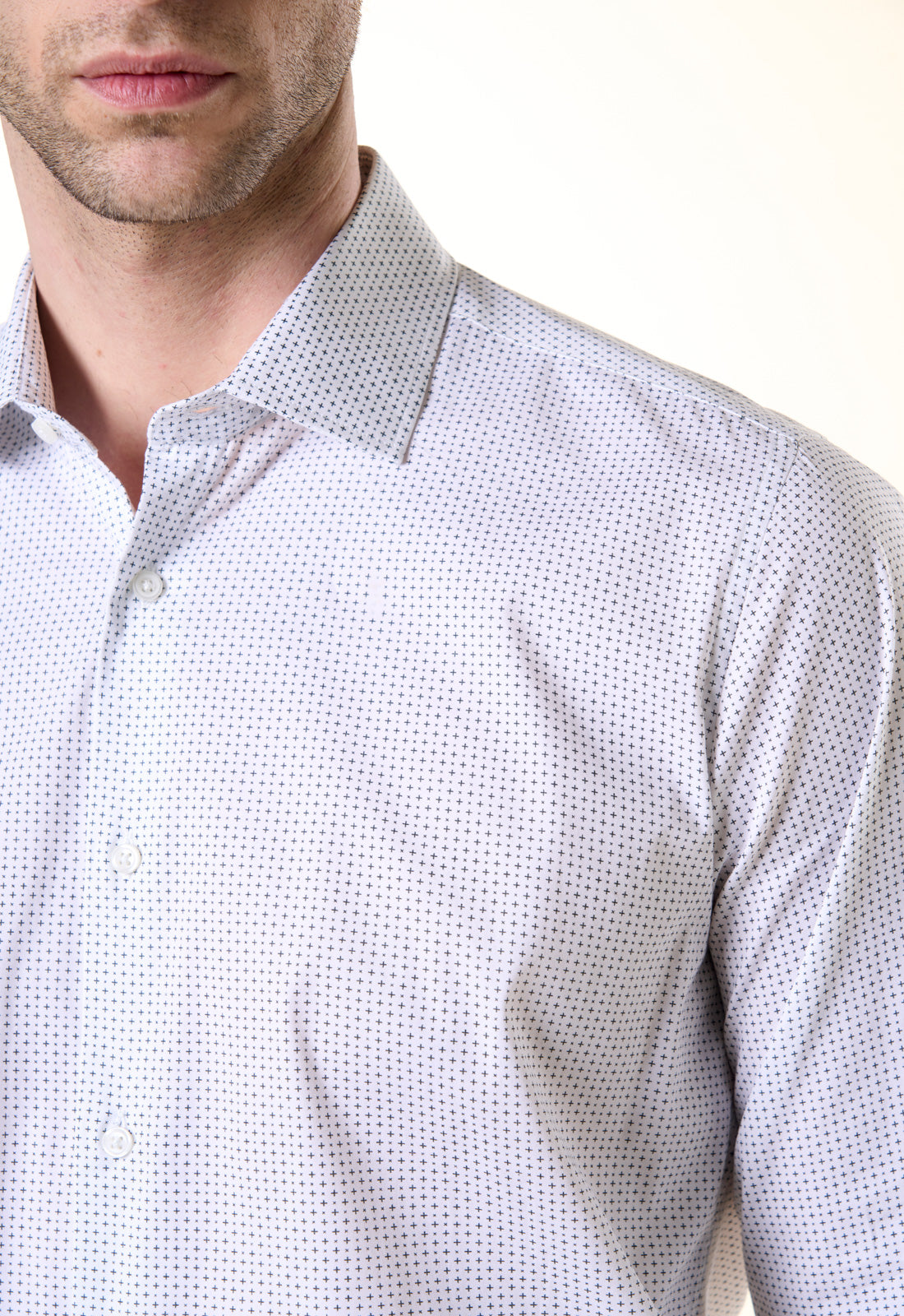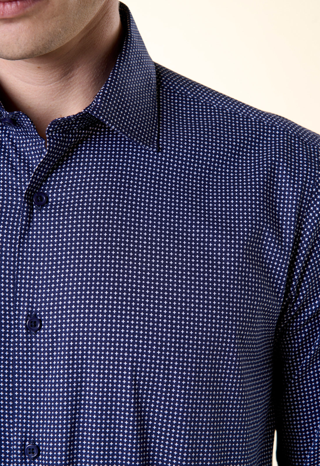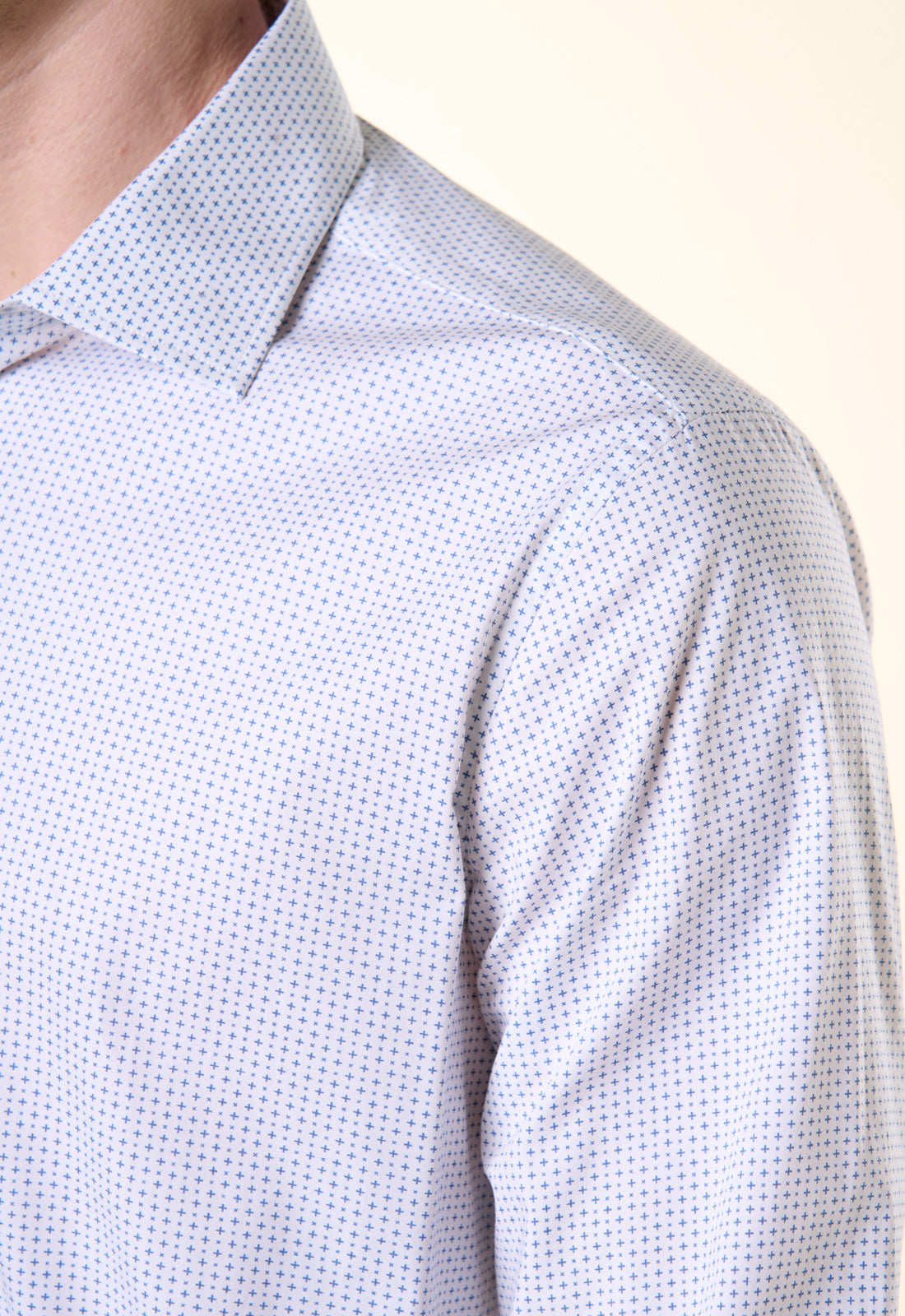 It combines precision tailoring and a contemporary graphic design. This shirt stands out for its delicate micro-pattern of small crosses, which creates an optical illusion of depth and a sophisticated visual texture. Perfect for those seeking a modern alternative to the classic solid-color shirt, without sacrificing formality. Slim Fit: A slim, tailored cut that flatters the figure, ensuring a clean line under blazers and jackets.