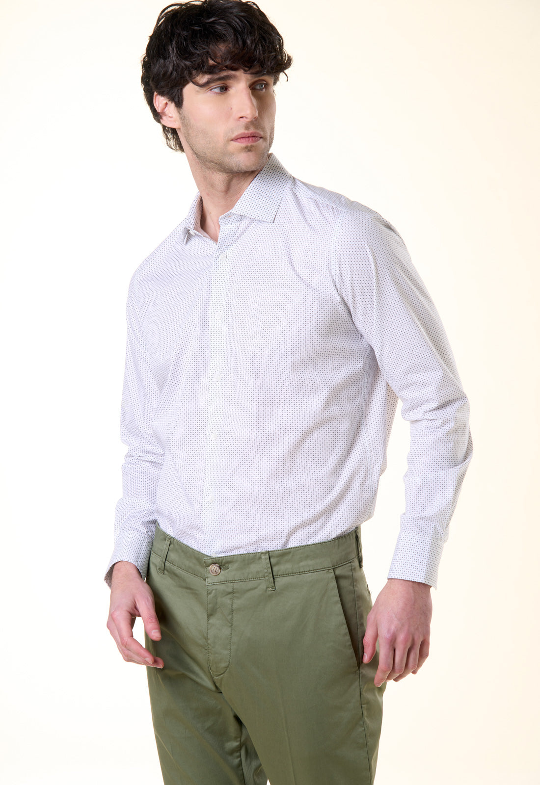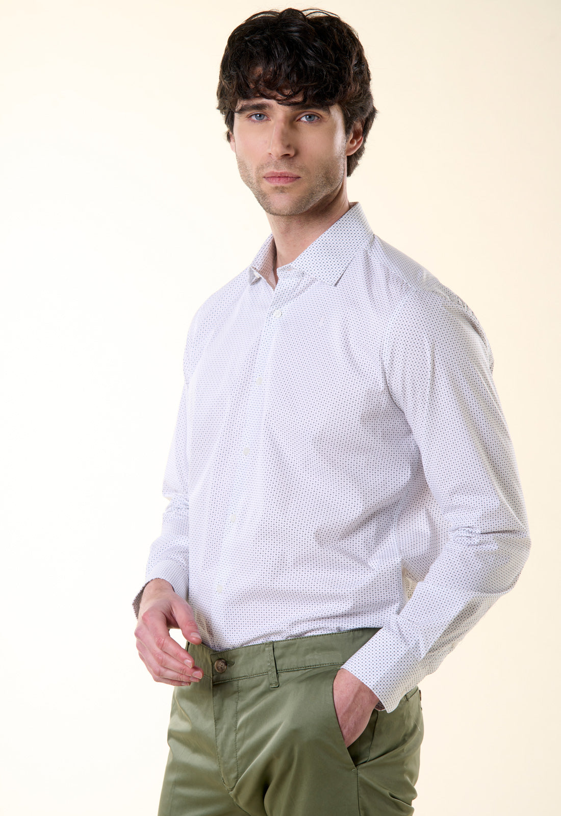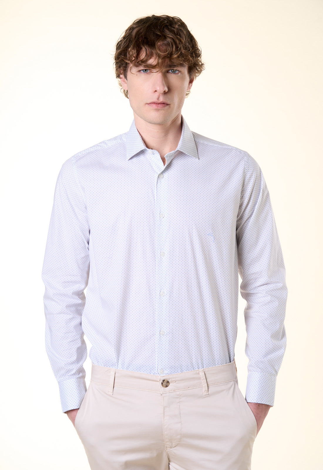 It combines precision tailoring and a contemporary graphic design. This shirt stands out for its delicate micro-pattern of small crosses, which creates an optical illusion of depth and a sophisticated visual texture. Perfect for those seeking a modern alternative to the classic solid-color shirt, without sacrificing formality. Slim Fit: A slim, tailored cut that flatters the figure, ensuring a clean line under blazers and jackets.