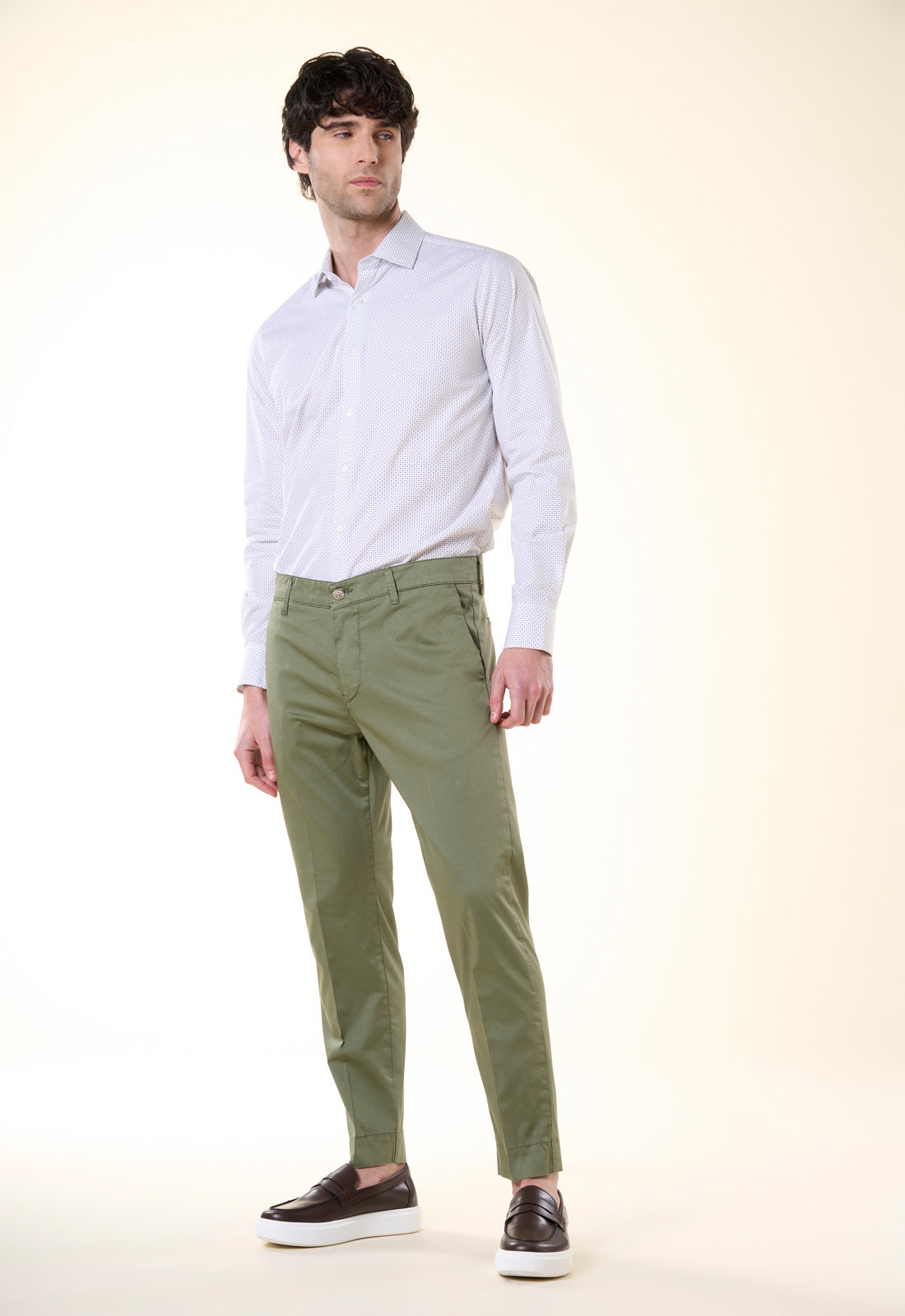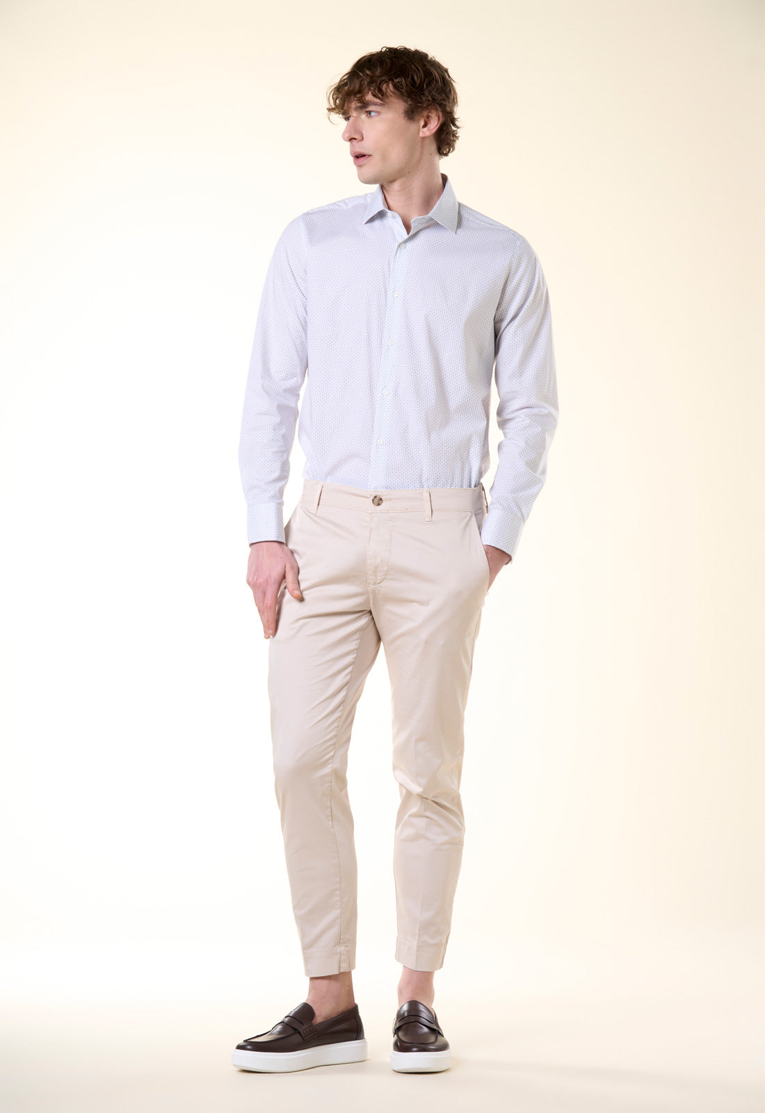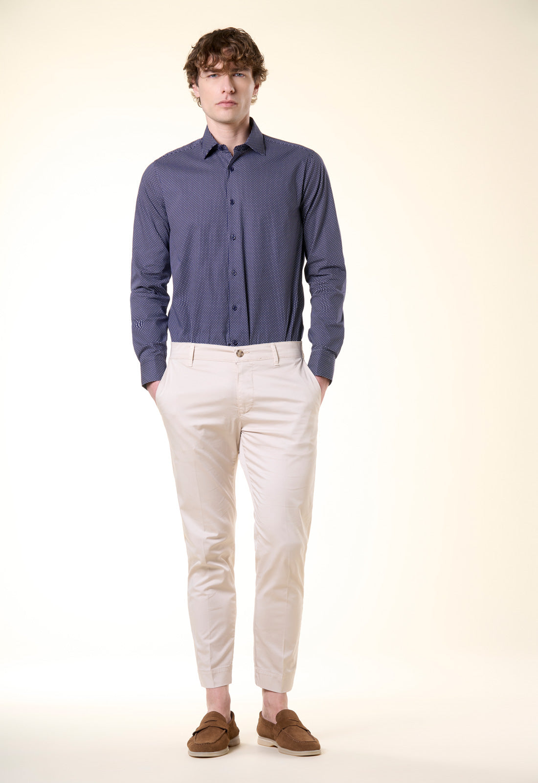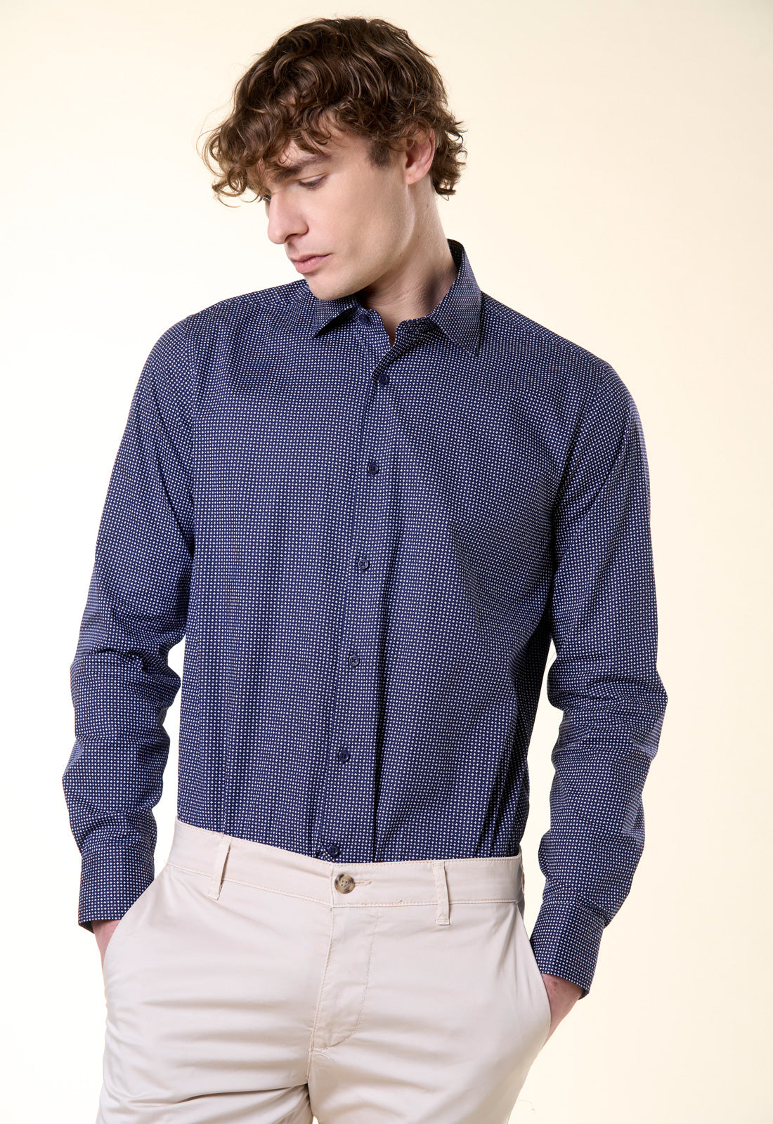 It combines precision tailoring and a contemporary graphic design. This shirt stands out for its delicate micro-pattern of small crosses, which creates an optical illusion of depth and a sophisticated visual texture. Perfect for those seeking a modern alternative to the classic solid-color shirt, without sacrificing formality. Slim Fit: A slim, tailored cut that flatters the figure, ensuring a clean line under blazers and jackets.