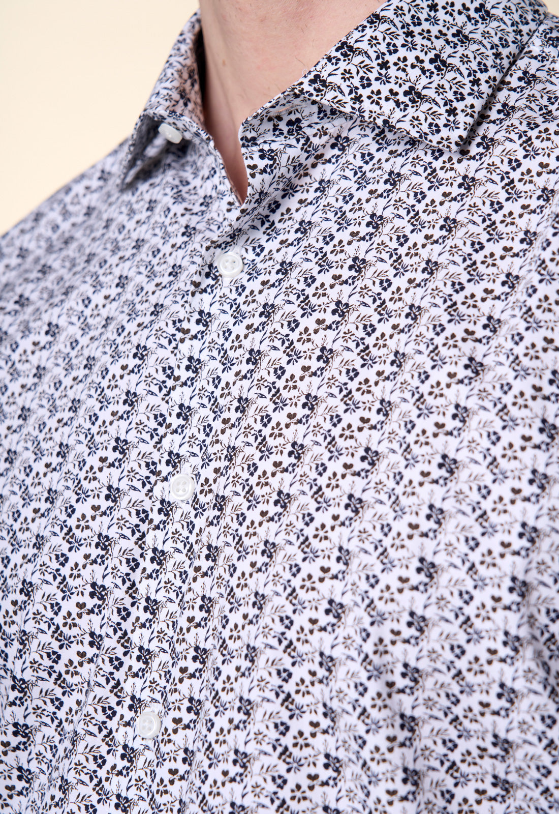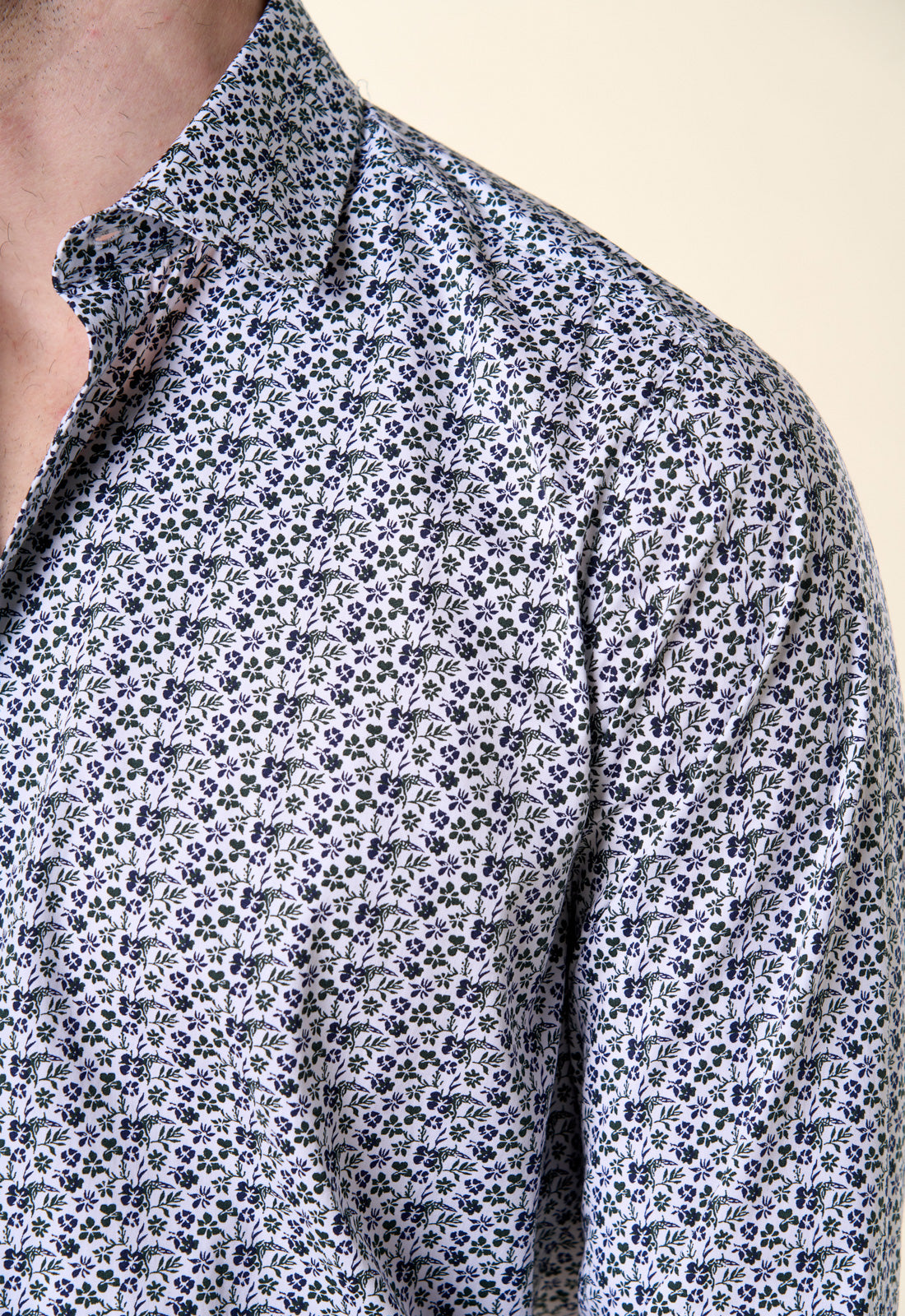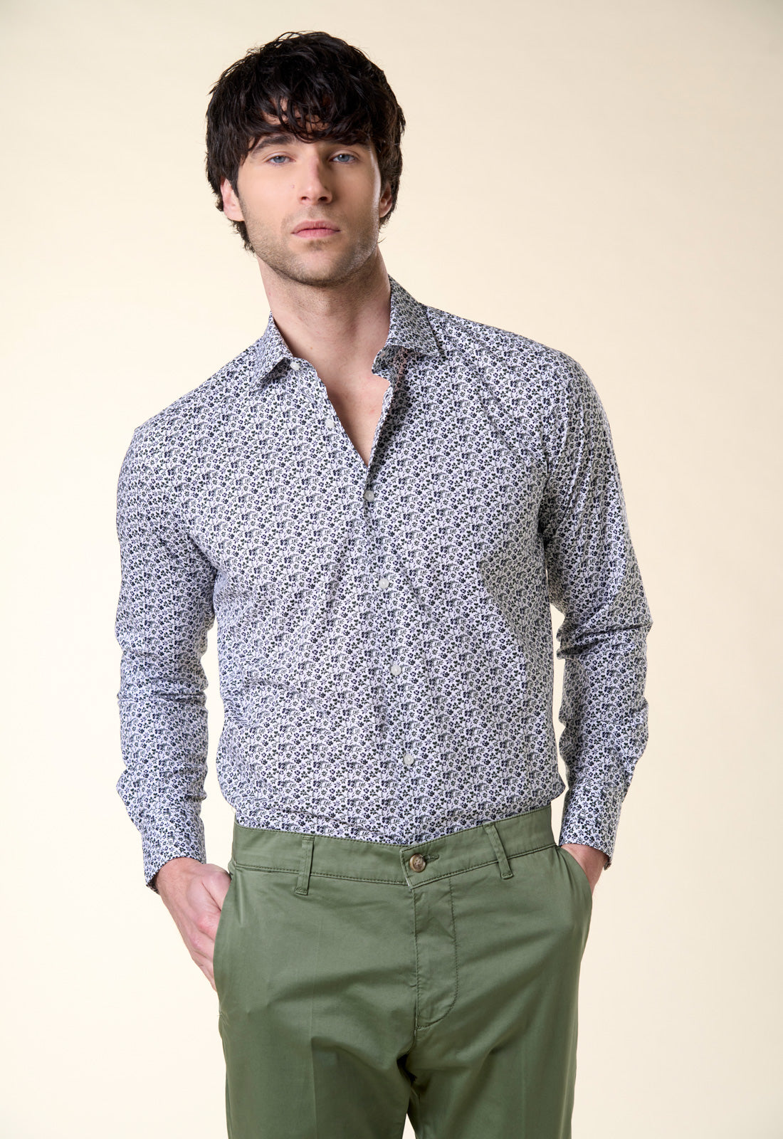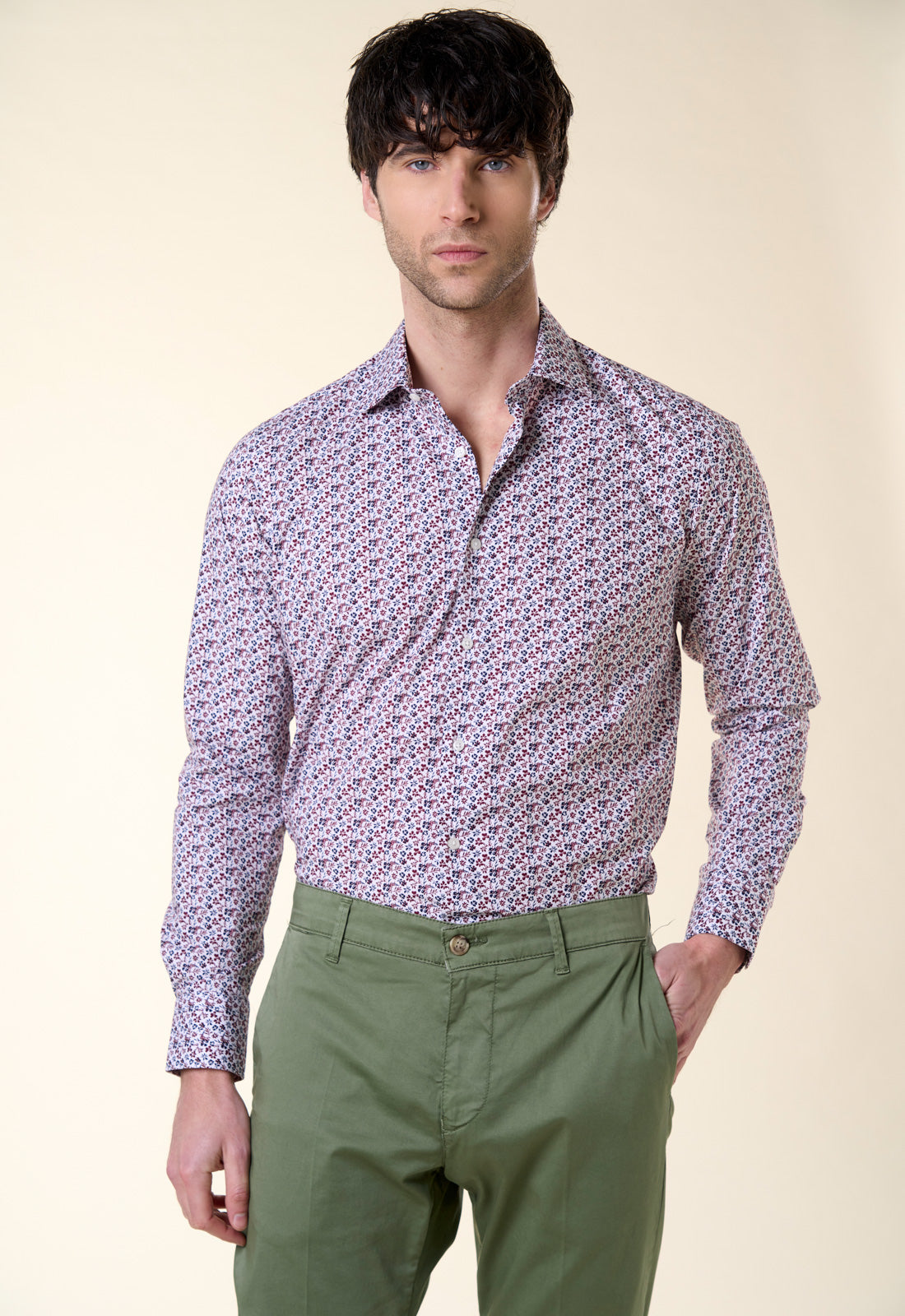 Elevate your everyday wardrobe with this vibrant shirt. Featuring a meticulous micro floral print in shades of burgundy and midnight blue on a white background, this piece strikes the perfect balance between classic elegance and contemporary design. Exclusive Pattern: A rich and detailed visual texture that adds depth to the outfit without being overwhelming. Modern Cut: Slim fit that follows the lines of the body naturally, ensuring a clean and tidy silhouette. Italian Collar: A versatile and well-proportioned collar, ideal worn open for a casual-chic look or with a thin tie for more formal settings. Quality Finishing: Contrasting white buttons and adjustable rounded cuffs. Made from breathable pure cotton, this shirt keeps you feeling fresh all day long. The quality of the fiber ensures easy ironing and excellent washability, maintaining the print's vibrant look over time. Style Tips For a sophisticated, urban look, pair it with olive green chinos (as shown in the photo) and chunky-soled loafers. If you prefer a more classic style, break it up with a dark blue suit to add a pop of color and texture to your office.