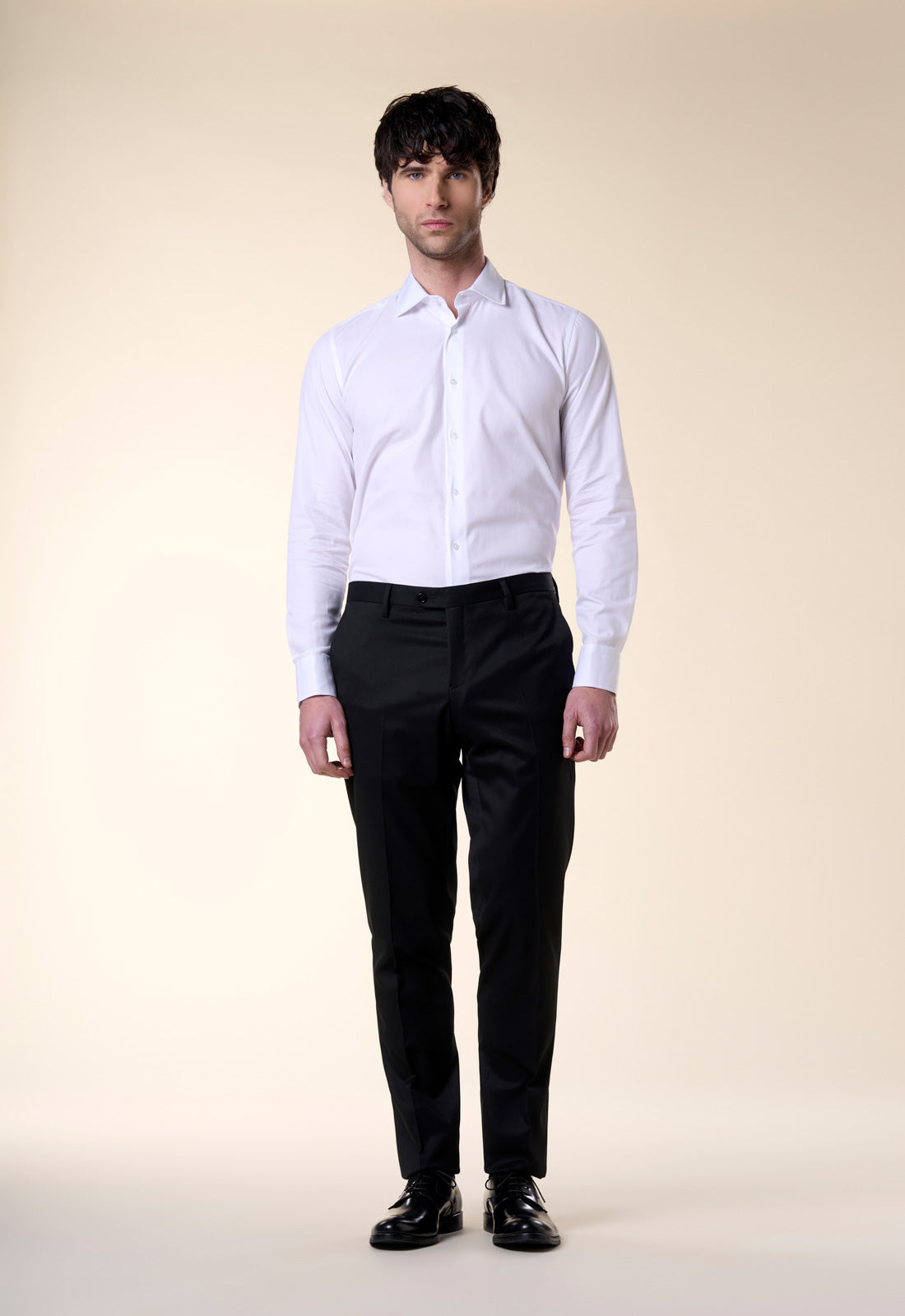 A classic essential reinterpreted with a distinctive texture. This white shirt is not your typical basic: the textured fabric features a micro-embossed design that adds dynamism to the surface, offering a subtle sheen and a structured yet pleasant feel. Details that make the difference: Advanced Texture: The textured finish (geometric micro-pattern) adds visual depth to the white, making the garment perfect for those seeking sophisticated and never banal elegance. Slim Fit: Designed to enhance the male figure, it offers a cut close to the torso that ensures a clean line under the jacket, without sacrificing comfort. Open Italian Collar: A versatile design that perfectly frames the face, ideal to wear without a tie for a "business-ready" look or with an important knot for ceremonies and events. Premium Finishes: High cuffs with rounded corners and matching shiny buttons. Smooth placket for a minimalist and modern aesthetic. Outfit Tips: For a formal and refined look, pair it with black tailored trousers (as shown in the photo) and polished Oxford shoes. For a smart office setting, wear it with dark jeans or charcoal gray chinos: the textured fabric will make your style stand out even on the most relaxed occasions.