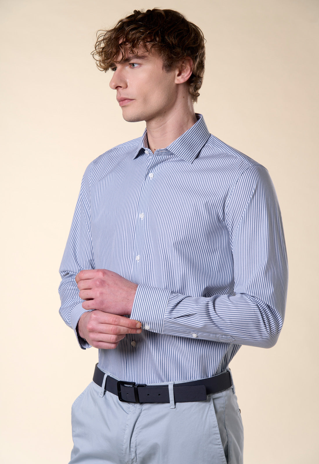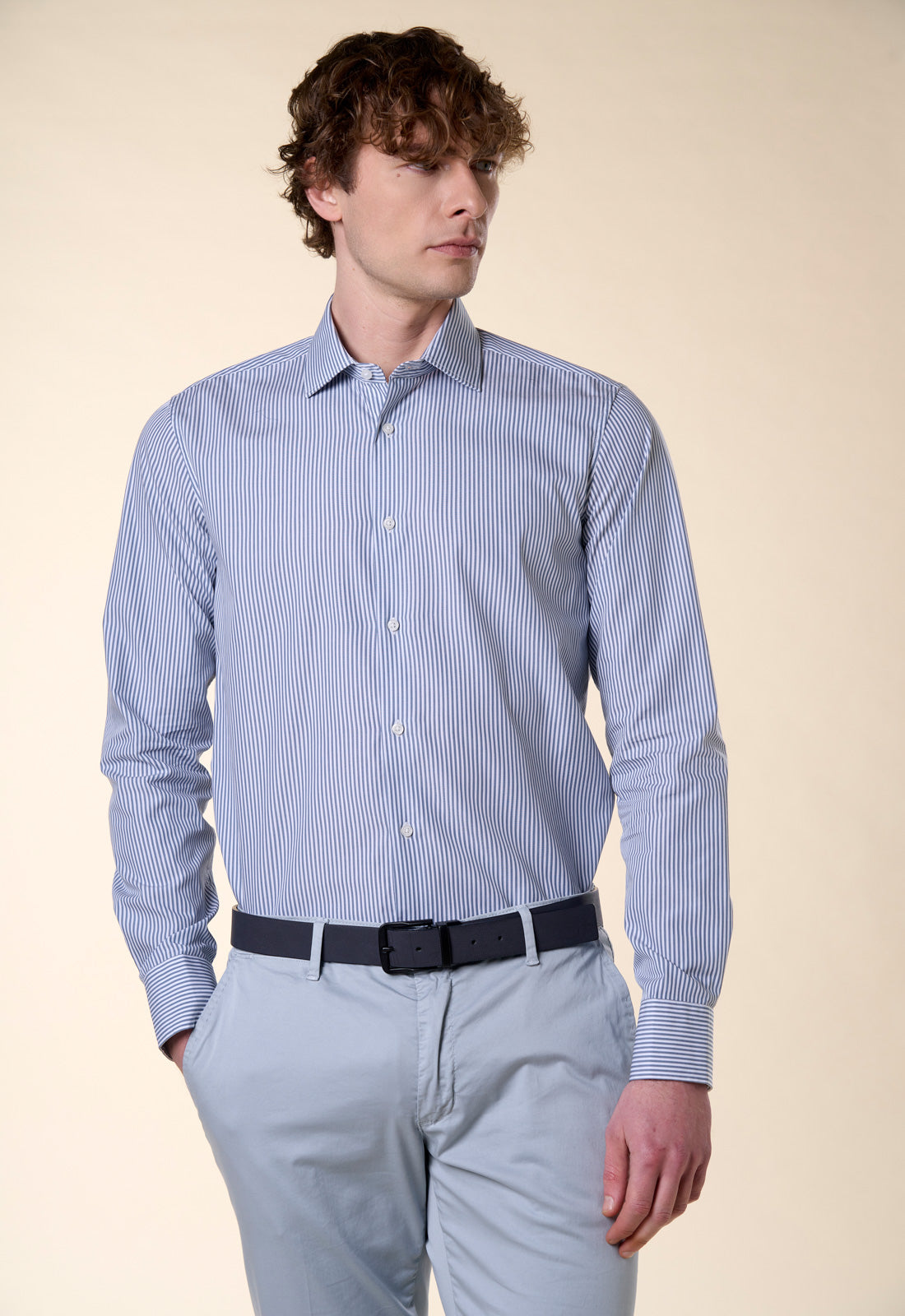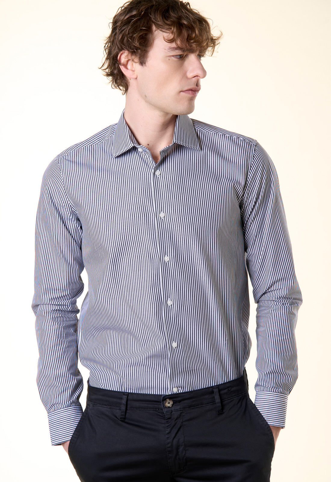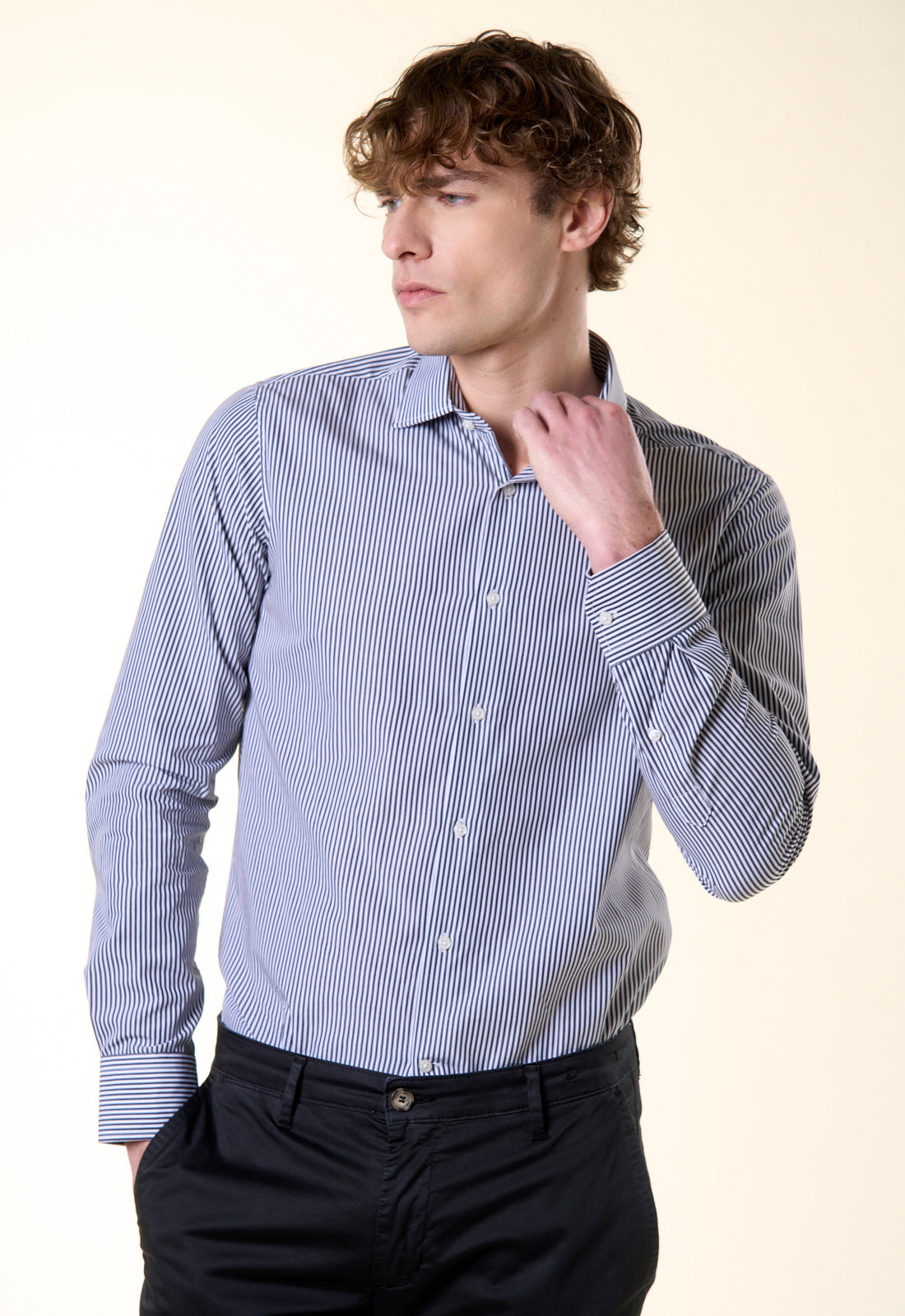 Freshen up your formal style with this vertically striped shirt, a staple of the modern men's wardrobe. Featuring a crisp blue and white striped weave, this shirt offers a natural shine that pairs perfectly with tailored suits or more relaxed looks with chinos. Premium Fabric: Made from high-quality cotton with a textured finish that ensures breathability and a flawless fit all day long. Classic Pattern: The blue vertical stripes create a slimming visual effect and add depth to the garment's texture. Versatile Collar: The semi-closed point collar is designed to elegantly frame the face, ideal for wearing both open and with a slim knot tie. Contemporary Cut: A fit designed to offer comfort during movement without sacrificing a clean and defined silhouette. Refined Finishes: Contrasting white buttons and classic cuffs with adjustable buttons for maximum tailoring precision. Outfit Tips: Office Look: Pair it with navy blue trousers and a brown braided belt for a professional yet dynamic aesthetic. Weekend Look: Wear it with pearl or ice grey chinos and dark loafers for a sophisticated outfit suitable for leisure time.