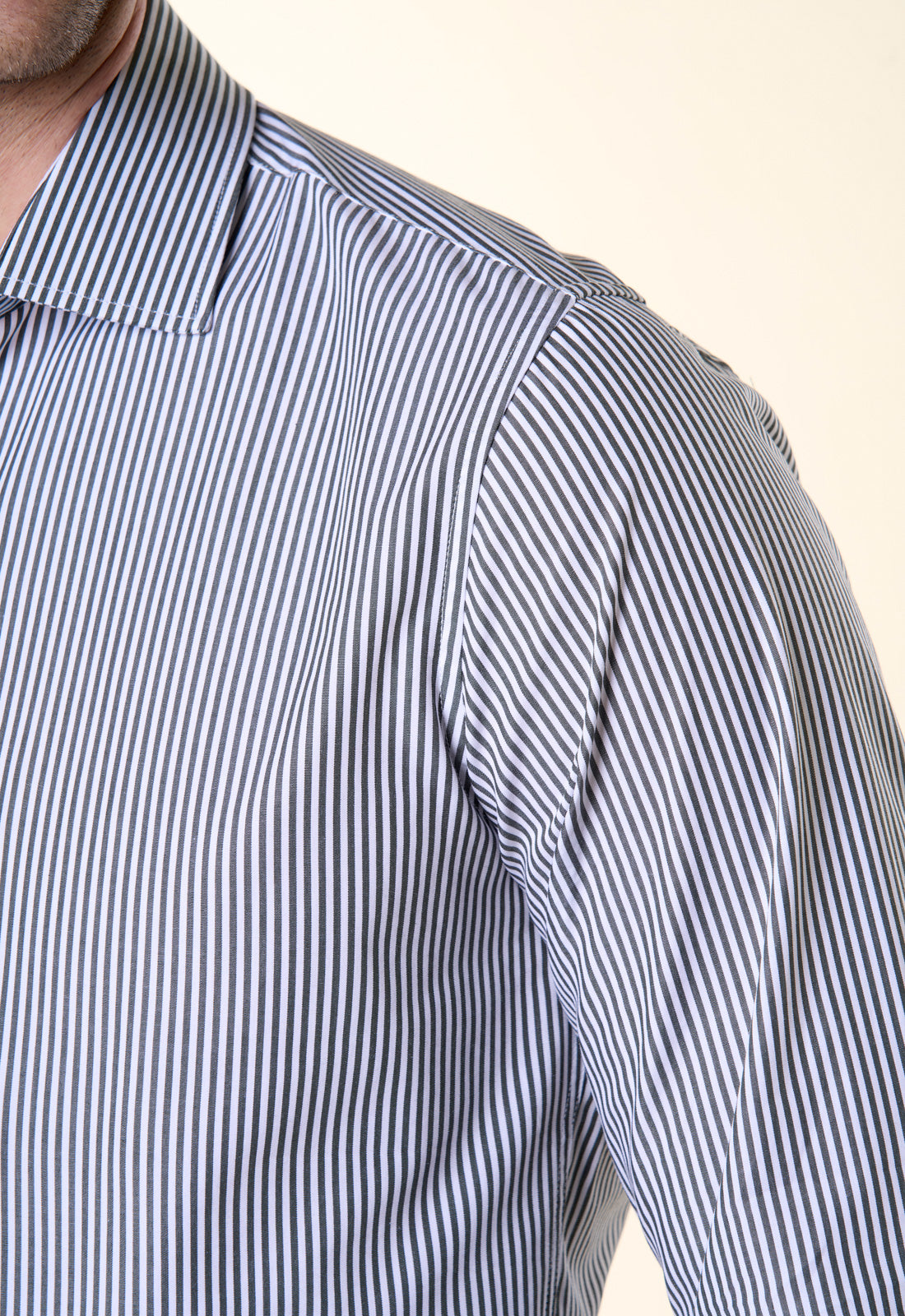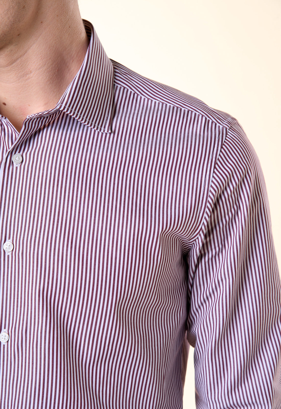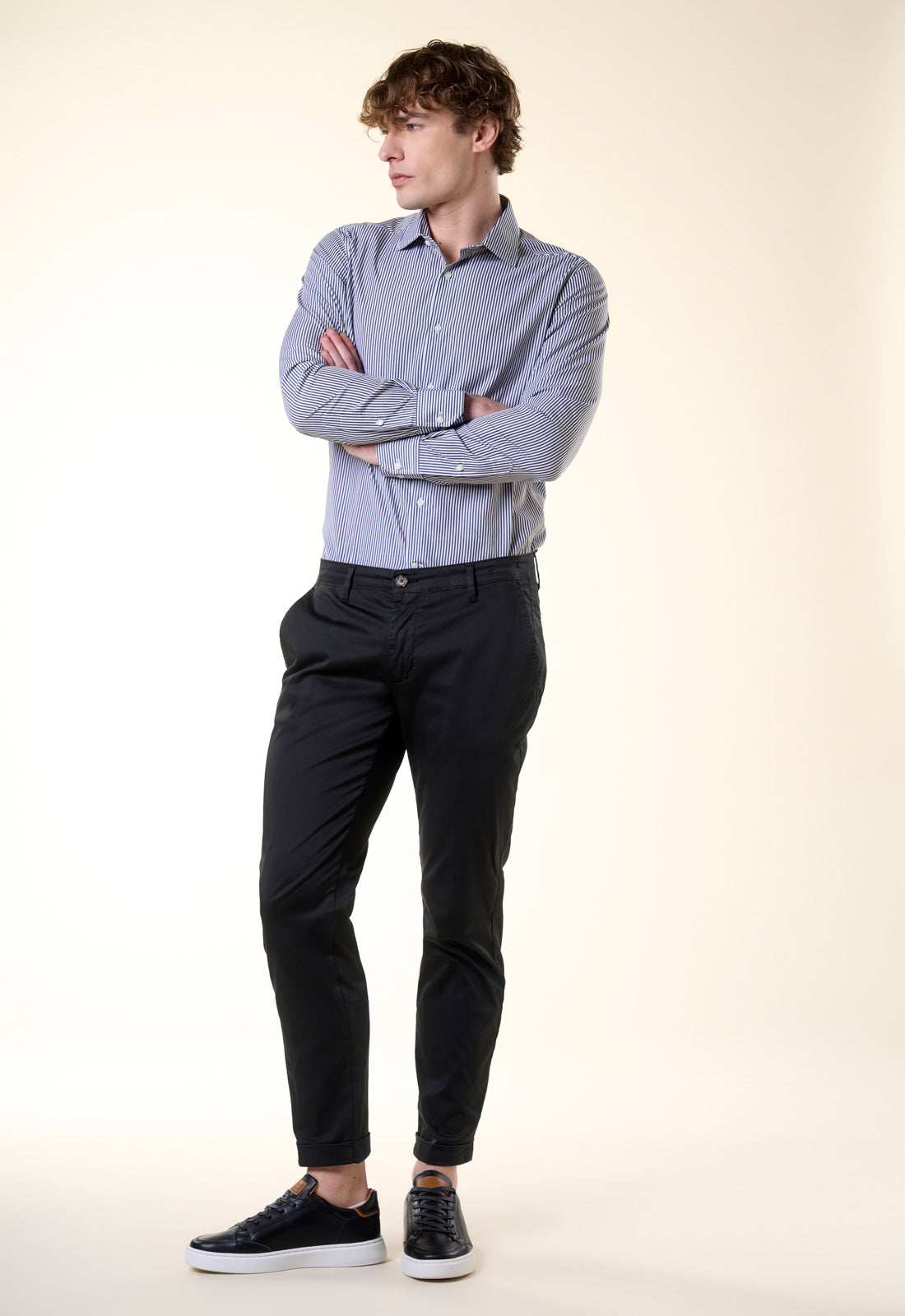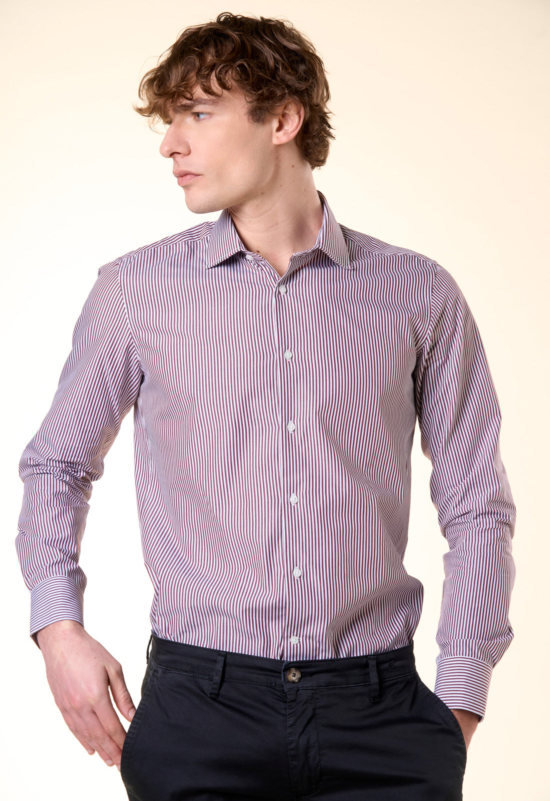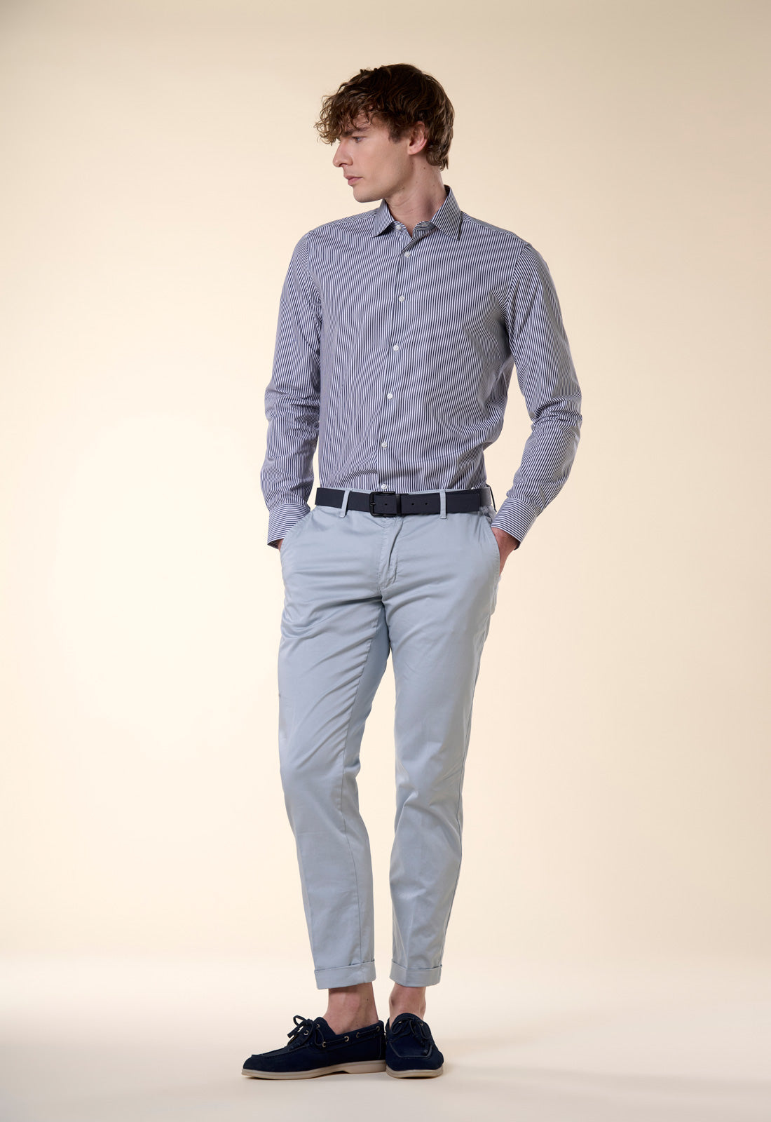 Freshen up your formal style with this vertically striped shirt, a staple of the modern men's wardrobe. Featuring a crisp blue and white striped weave, this shirt offers a natural shine that pairs perfectly with tailored suits or more relaxed looks with chinos. Premium Fabric: Made from high-quality cotton with a textured finish that ensures breathability and a flawless fit all day long. Classic Pattern: The blue vertical stripes create a slimming visual effect and add depth to the garment's texture. Versatile Collar: The semi-closed point collar is designed to elegantly frame the face, ideal for wearing both open and with a slim knot tie. Contemporary Cut: A fit designed to offer comfort during movement without sacrificing a clean and defined silhouette. Refined Finishes: Contrasting white buttons and classic cuffs with adjustable buttons for maximum tailoring precision. Outfit Tips: Office Look: Pair it with navy blue trousers and a brown braided belt for a professional yet dynamic aesthetic. Weekend Look: Wear it with pearl or ice grey chinos and dark loafers for a sophisticated outfit suitable for leisure time.
