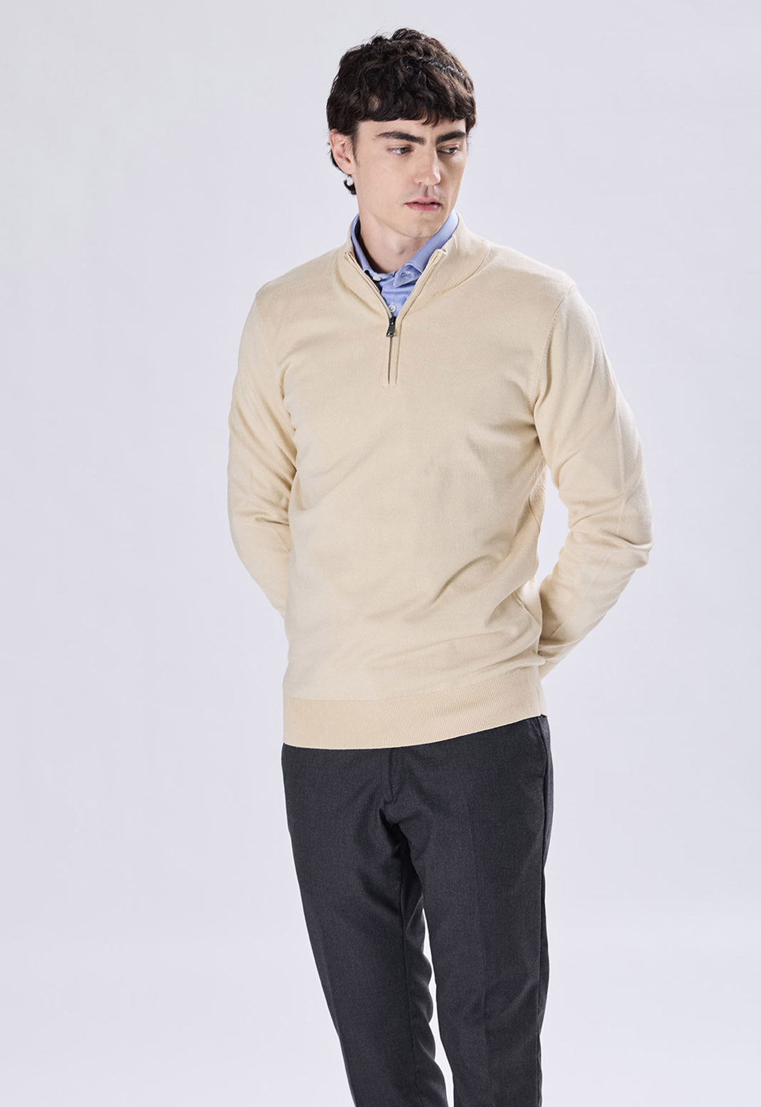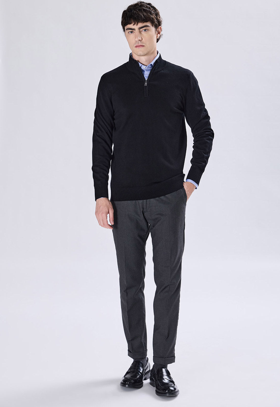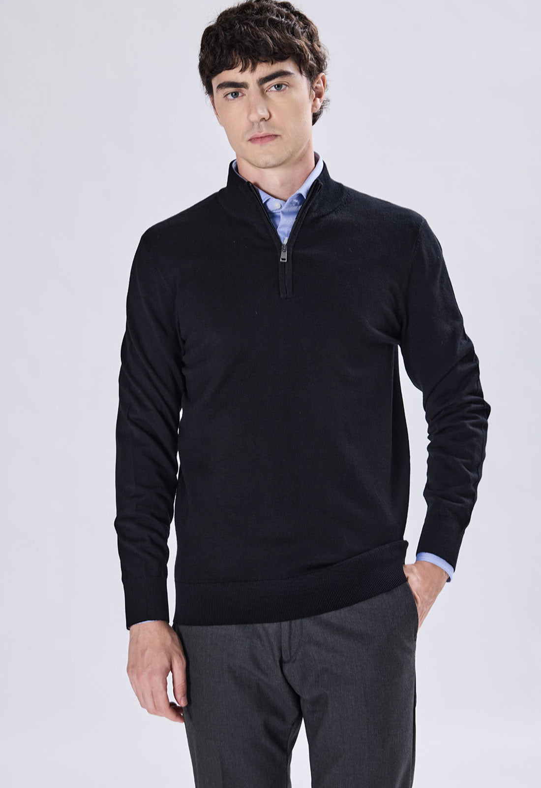 The design features a refined high collar with a convenient half-zip that allows you to adjust the style: you can wear it closed for a more formal look or open with a shirt underneath, as shown in the photos, for a flawless business-casual look. The ribbed cuffs and hem ensure a perfect fit.