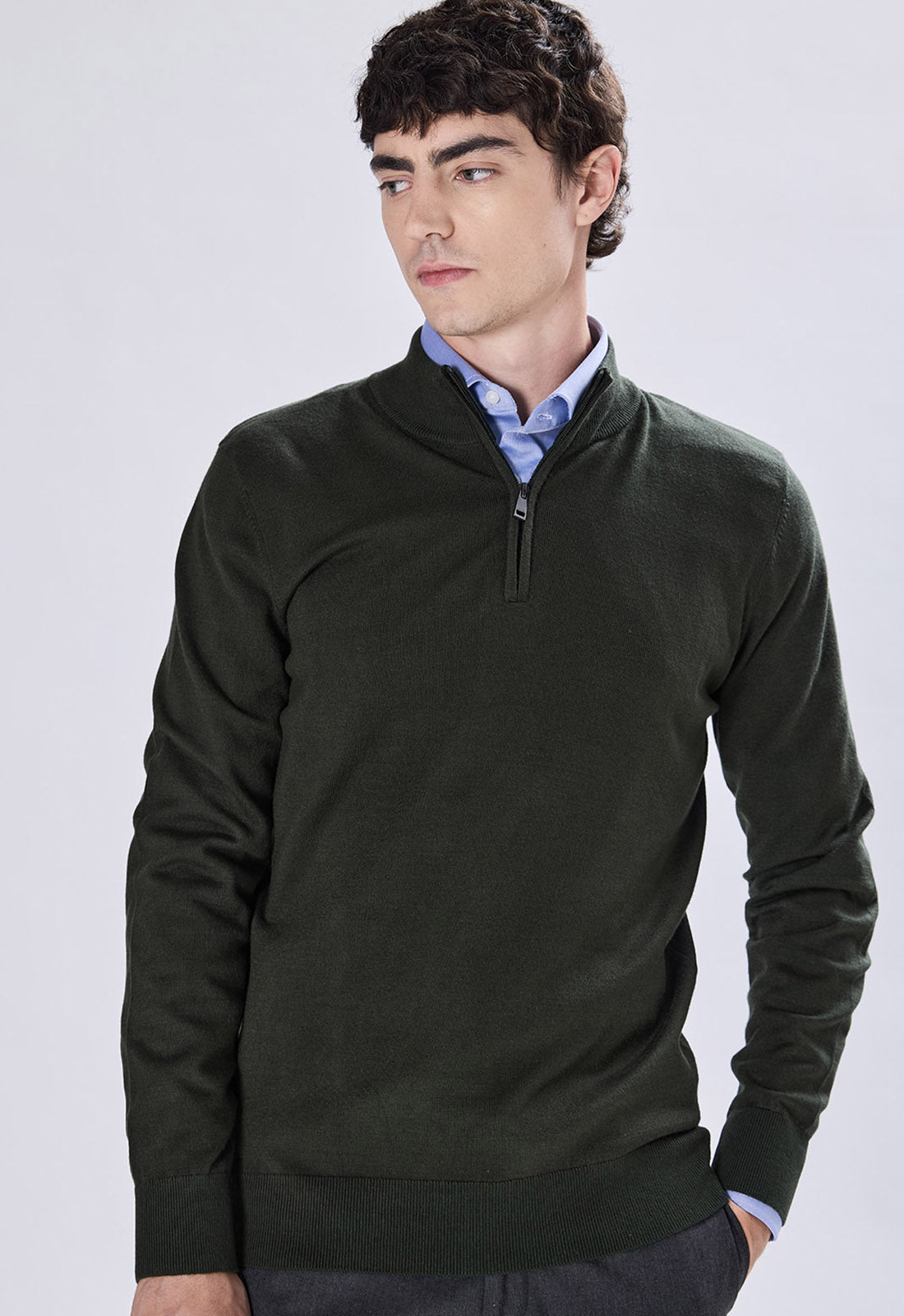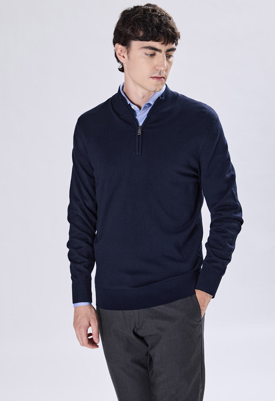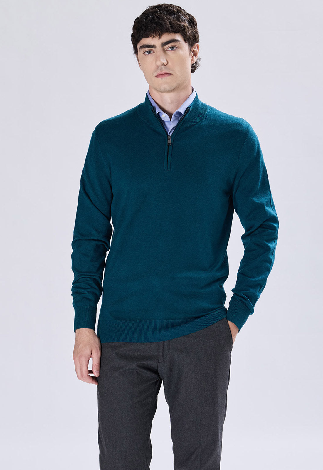 The design features a refined high collar with a convenient half-zip that allows you to adjust the style: you can wear it closed for a more formal look or open with a shirt underneath, as shown in the photos, for a flawless business-casual look. The ribbed cuffs and hem ensure a perfect fit.
