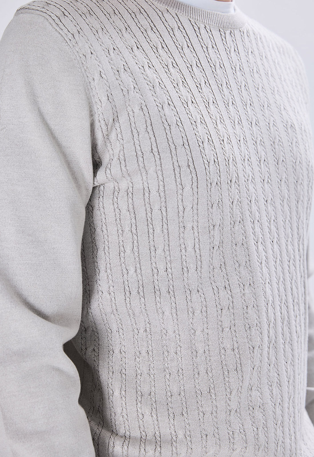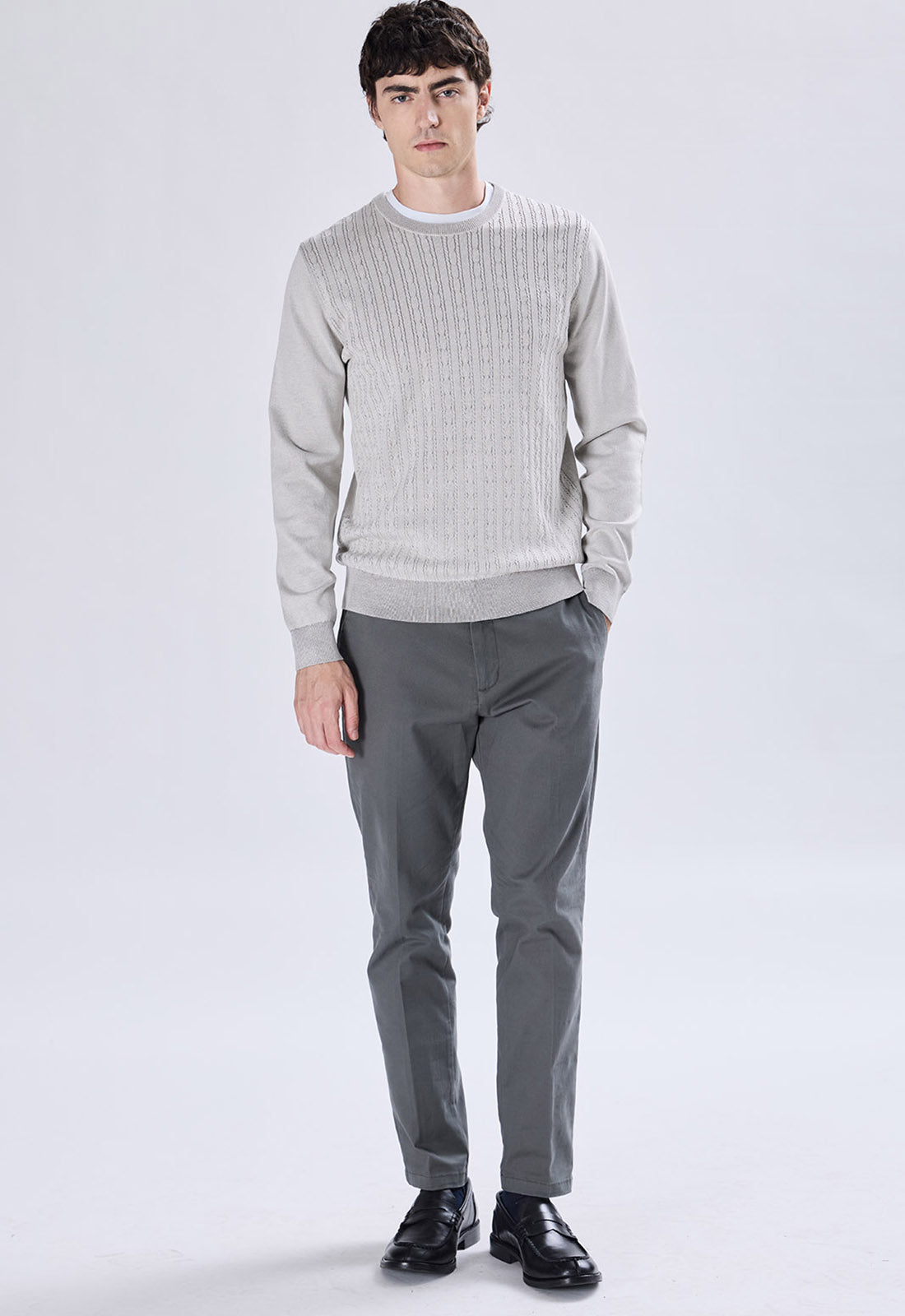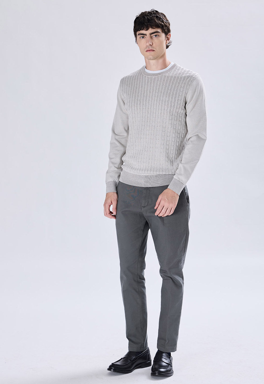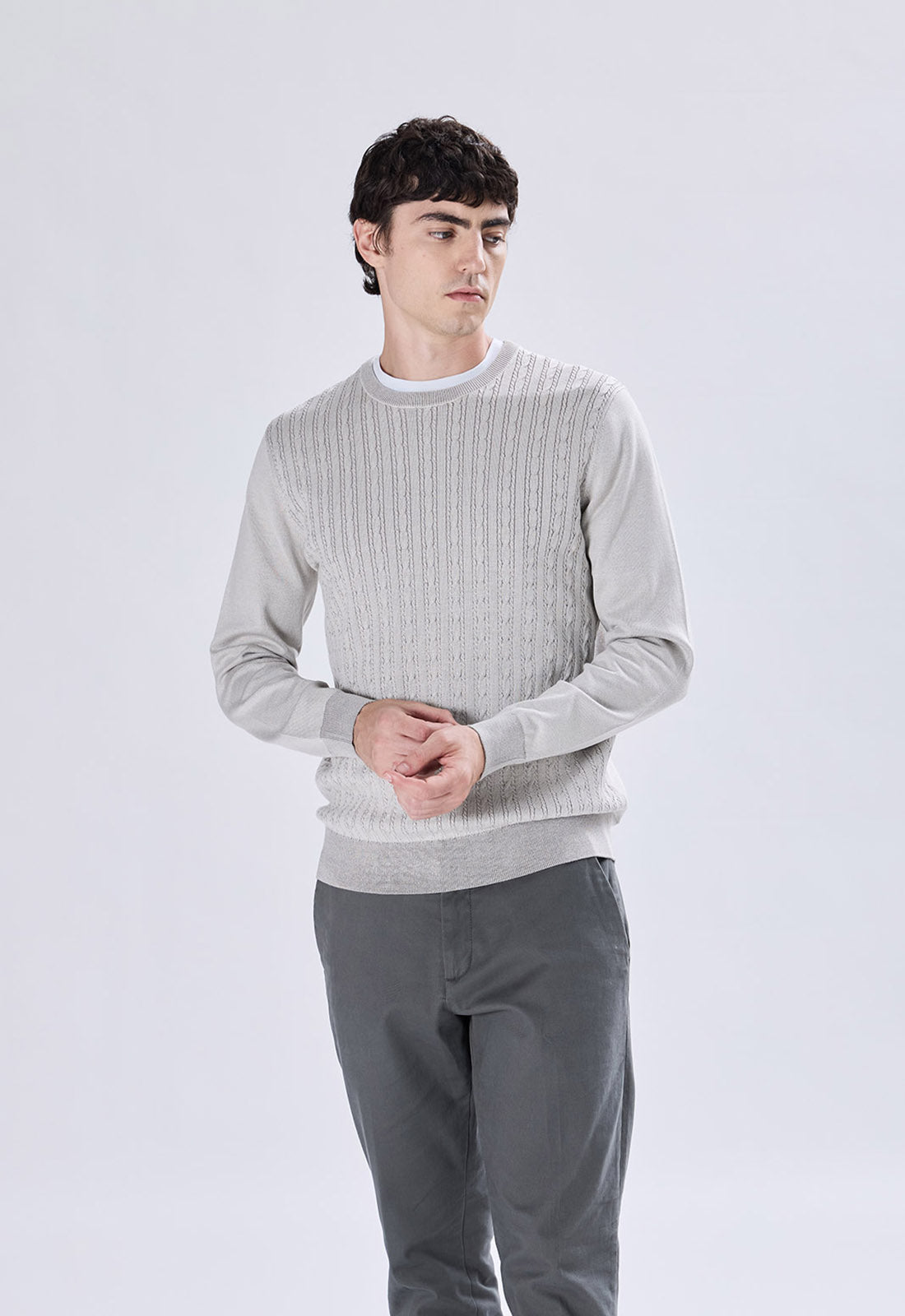 This cable-knit sweater is much more than a basic staple. It features a vertical cable knit on the front, adding an element of sophisticated craftsmanship and a striking visual detail. The rest of the sweater (sleeves and back) are kept plain for a modern contrast and a clean fit. Crafted from a comfortable, high-quality yarn, this crew neck sweater is incredibly versatile. Wear it over a white T-shirt for a relaxed look or with a shirt for a smart-casual office outfit, pairing it with tailored trousers or chinos, as shown in the photo. It's the ideal choice for those looking for a warm yet lightweight sweater, with a design that stands out from the crowd.