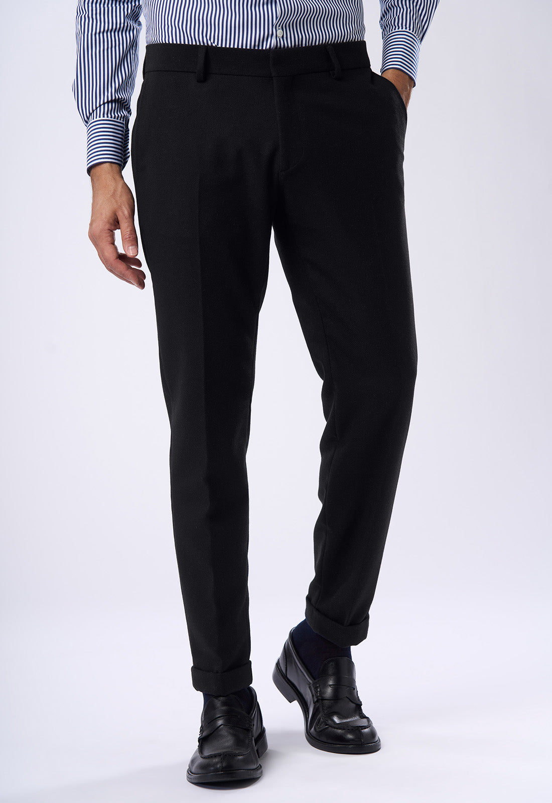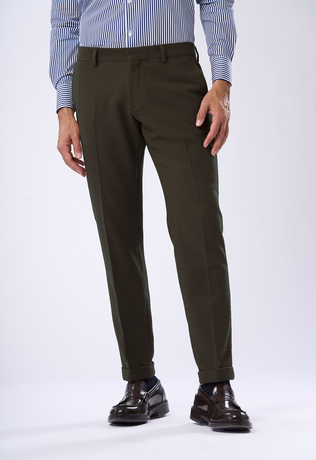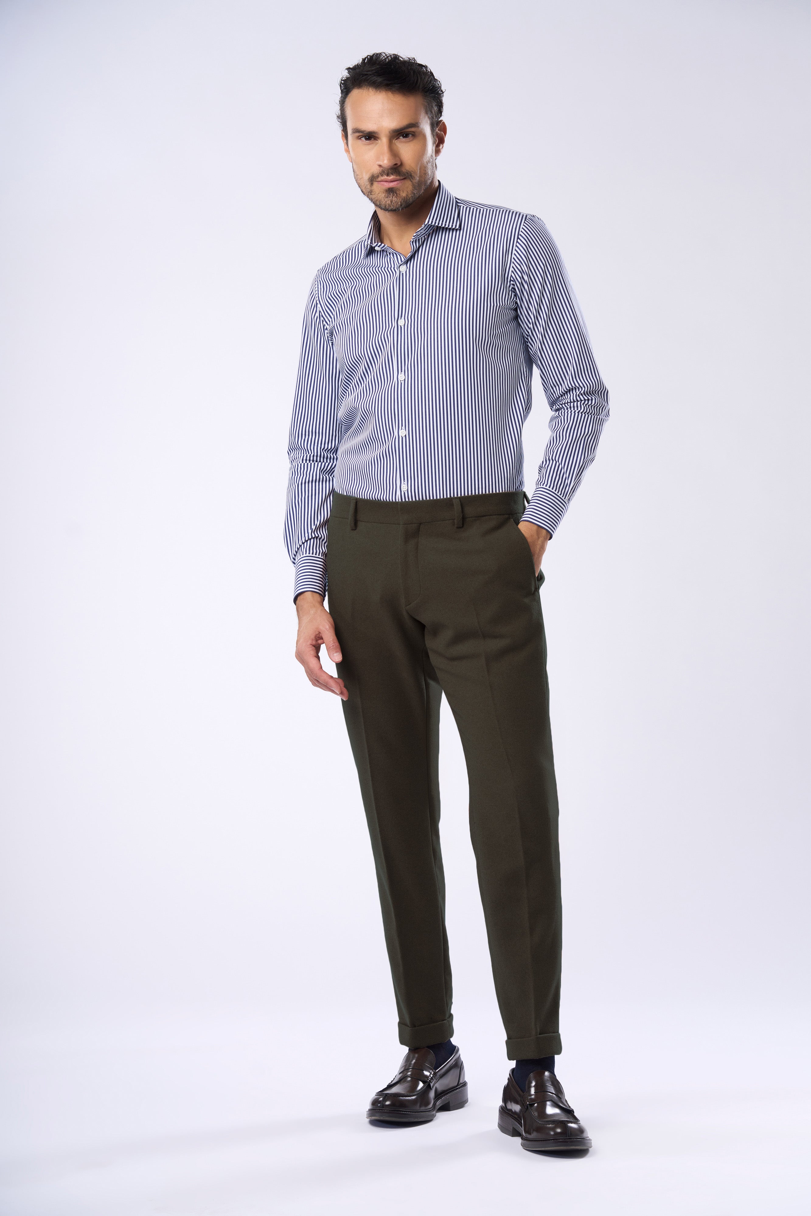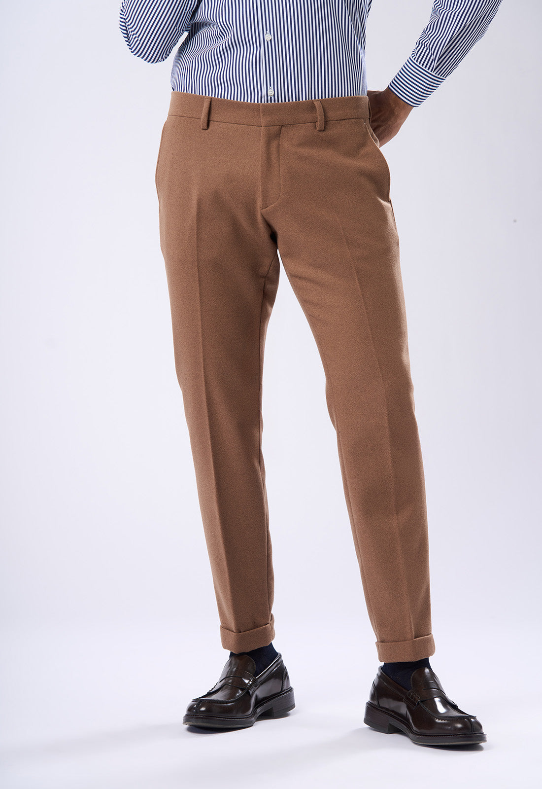 Questo pantalone dal taglio moderno è realizzato in flanella, ideale per un look invernale o di mezza stagione che non rinuncia all'eleganza. È il perfetto complemento alla giacca in flanella con cui forma uno spezzato o un completo tono su tono. Dettagli di Stile Modello: Pantalone sartoriale dalla linea slim o affusolata (tapered) sulla gamba. Tessuto: Panno o flanella leggera. Si nota una finitura leggermente a spazzolata tipica dei tessuti invernali caldi, che aggiunge un'ottima mano e drappeggio. Vita: Vita media, pulita con passanti per cintura. Dettagli Sartoriali: Tasche anteriori: All'americana (a taglio diagonale). Tasche posteriori: A filetto singola con chiusura a bottone in tinta (o leggermente a contrasto). Come Abbinarlo Questo pantalone è il fondamento per creare outfit di grande impatto. Tono su Tono: Abbinalo alla giacca dello stesso colore per un completo moderno e monocromatico. A Contrasto: Perfetto con maglieria scura (blu navy, bordeaux) e camicie a fantasia per un look meno formale ma sempre chic.