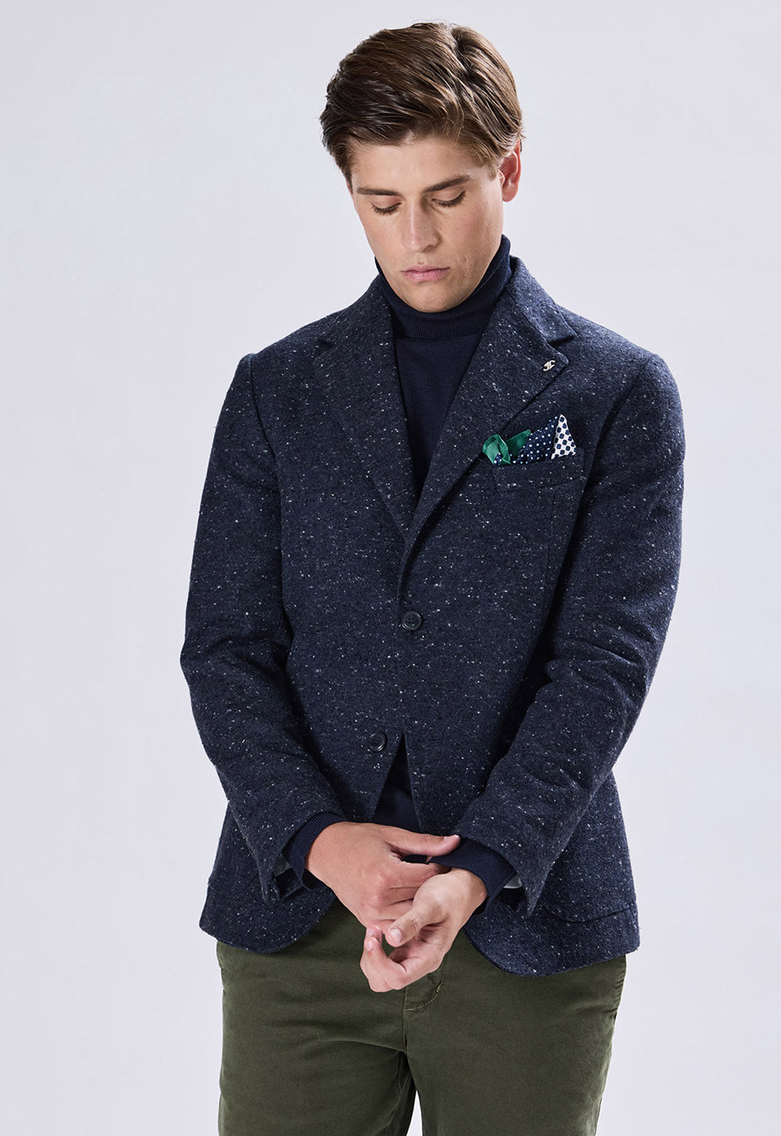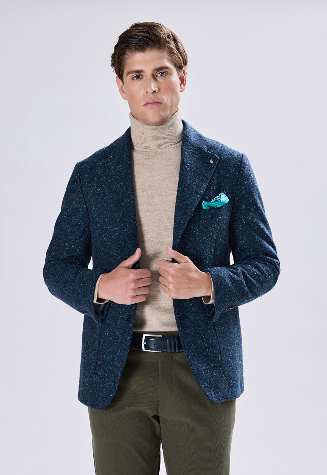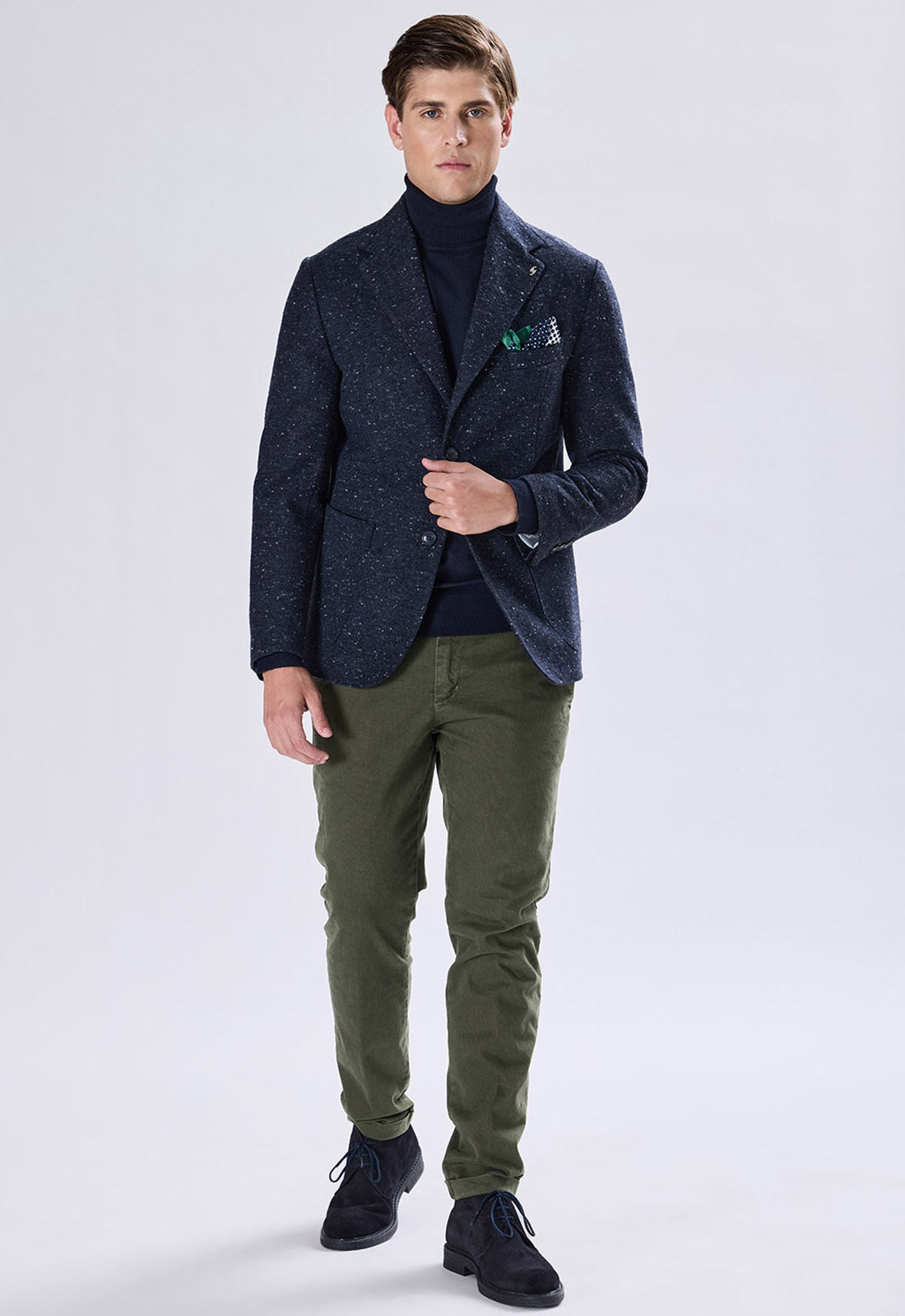 Wear it with a dark turtleneck for a refined look (as pictured), or pair it with a knit shirt and tie for the office. Contrasting trousers, like the military green one pictured, enhance the richness of the fabric.