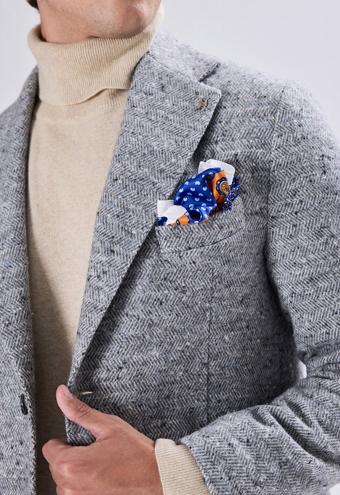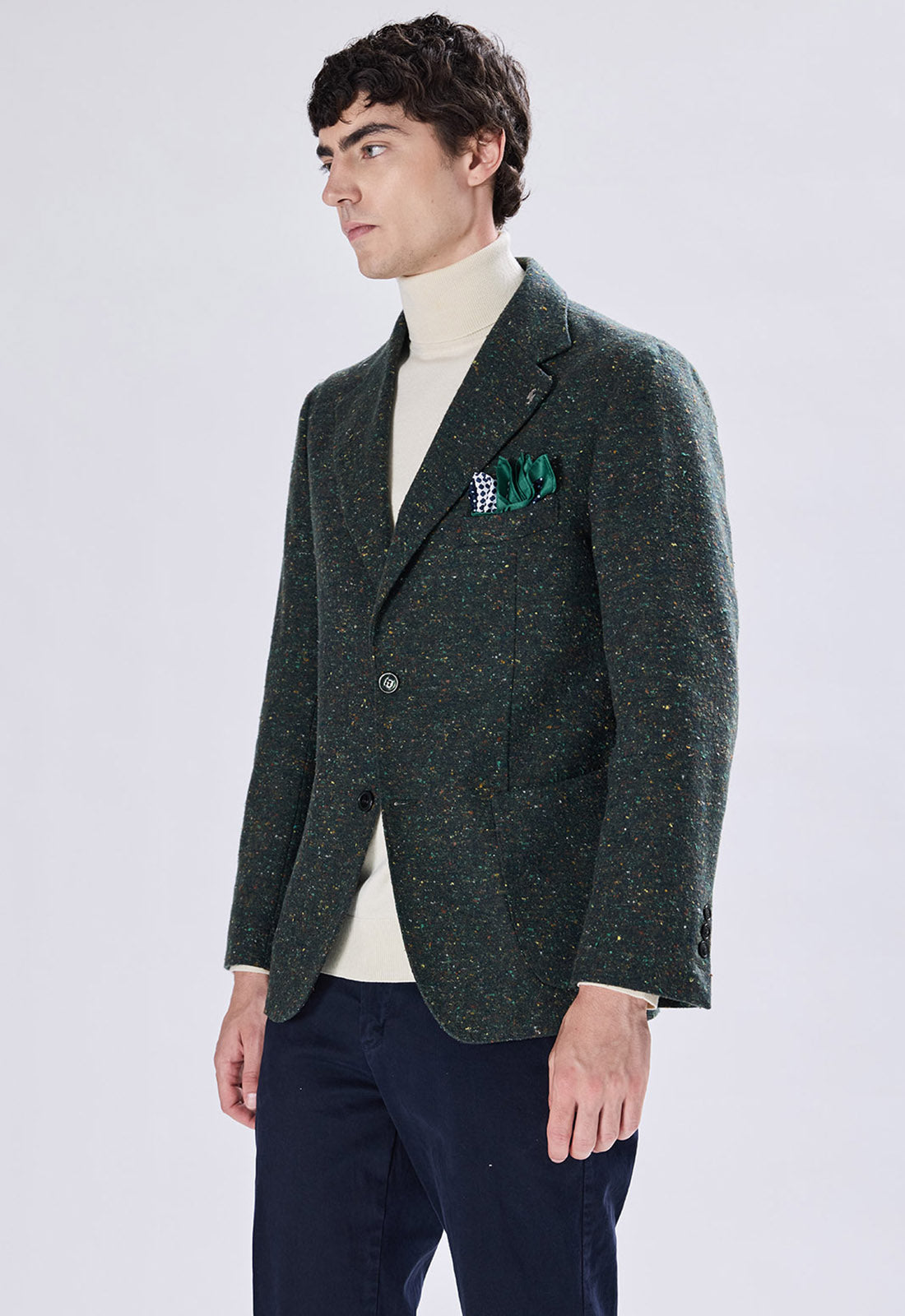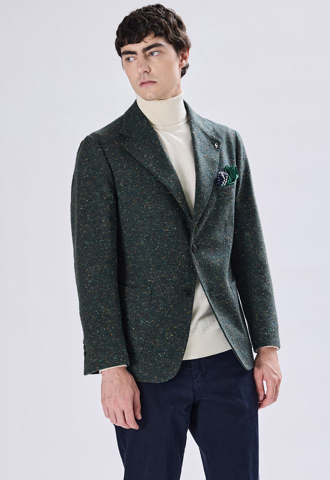 This blazer is the perfect choice for the man looking for a modern and distinctive alternative to the classic suit. The fabric features a distinctive tweed/bouclé weave with light speckles that give the jacket a unique and visually interesting texture.