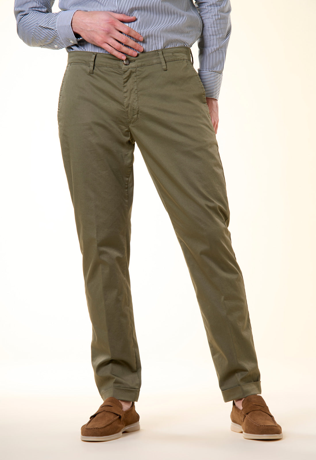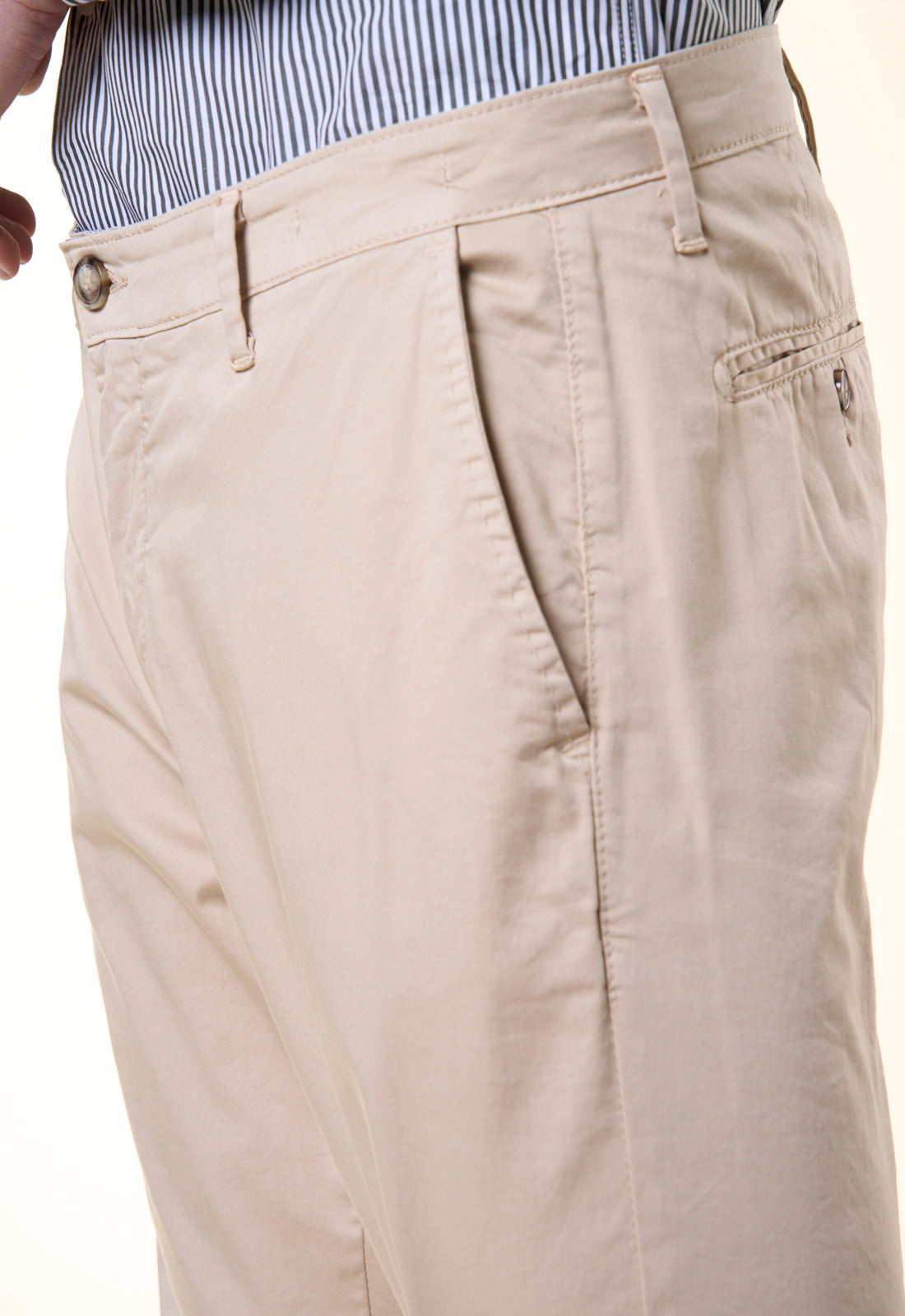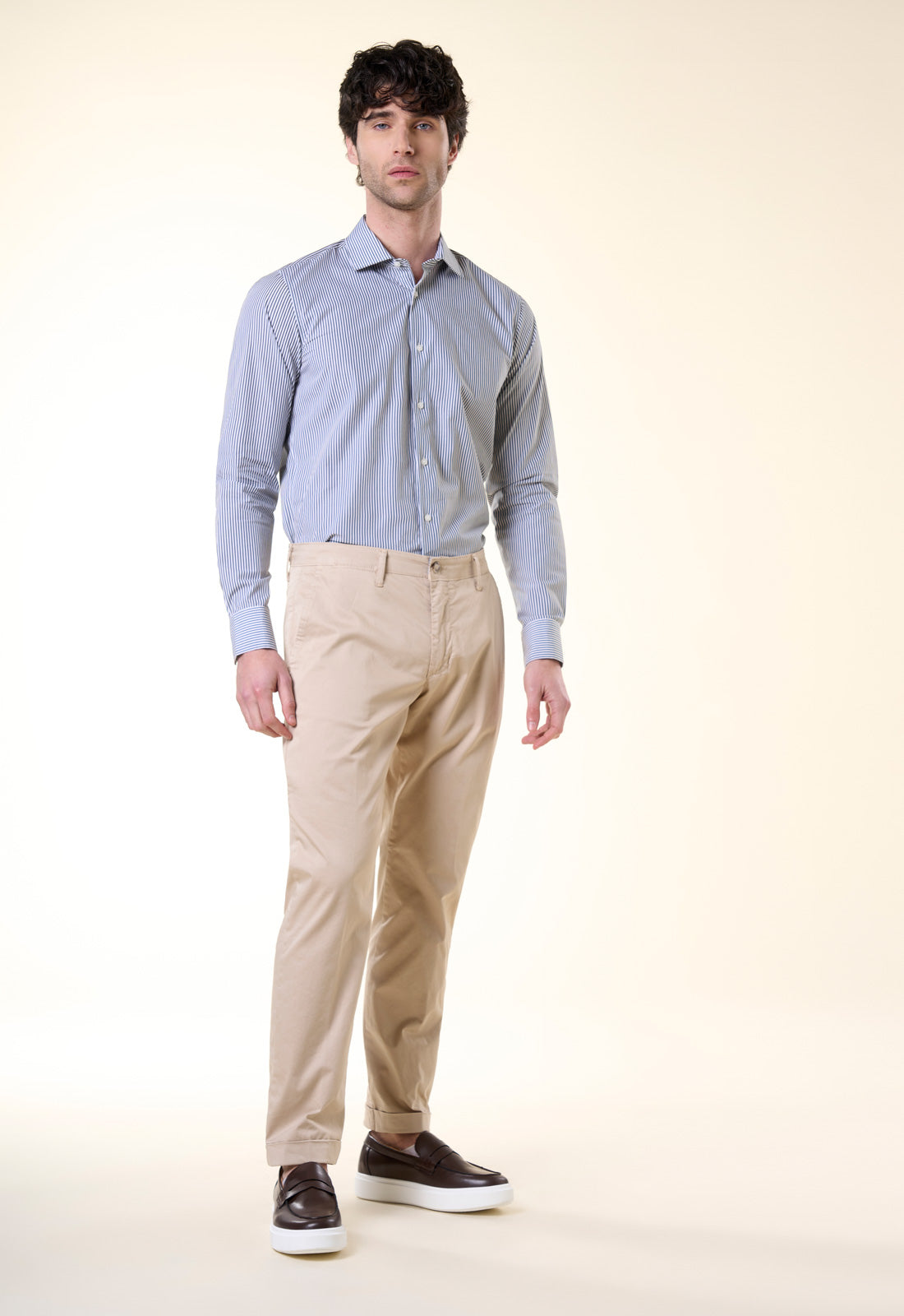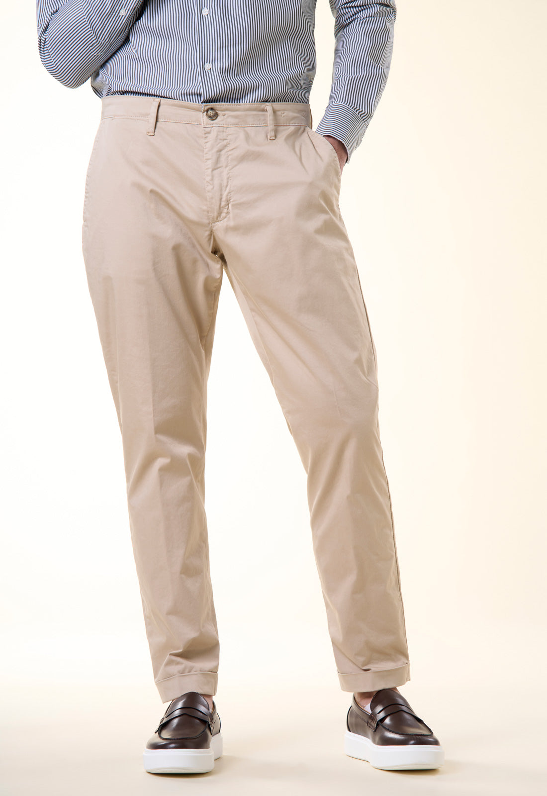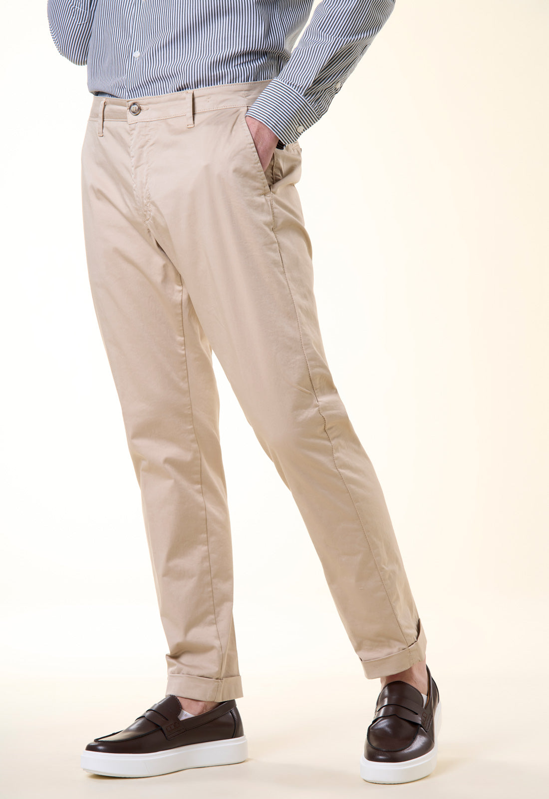 Il pilastro indispensabile di ogni guardaroba maschile: il pantalone chino nella classica tonalità sabbia. Questo modello coniuga una silhouette pulita e formale con la praticità necessaria per affrontare la giornata, dall'ufficio al tempo libero. Realizzato in un twill di cotone leggermente elasticizzato, garantisce un comfort ottimale e una vestibilità che accompagna i movimenti senza rinunciare a una linea definita e sartoriale.