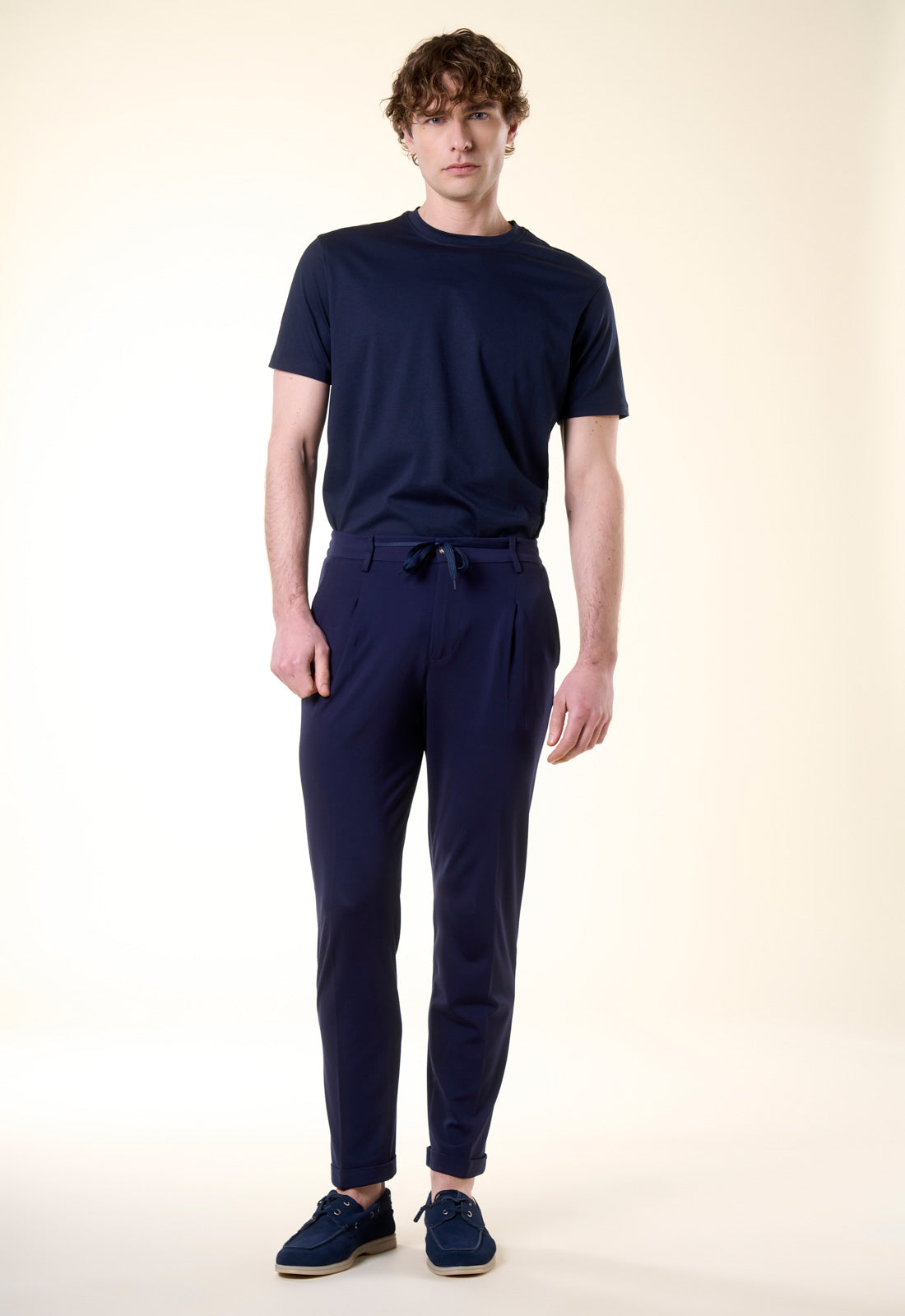 Il perfetto connubio tra l'estetica formale e il comfort estremo dello stile urban. Questo pantalone in jersey tecnico è progettato per chi non vuole scendere a compromessi tra eleganza e libertà di movimento, grazie a un tessuto elasticizzato che segue ogni gesto senza costrizioni. Comfort Evoluto: Vita elasticizzata dotata di coulisse regolabile con stringhe in tono, per una vestibilità personalizzata e rilassata.